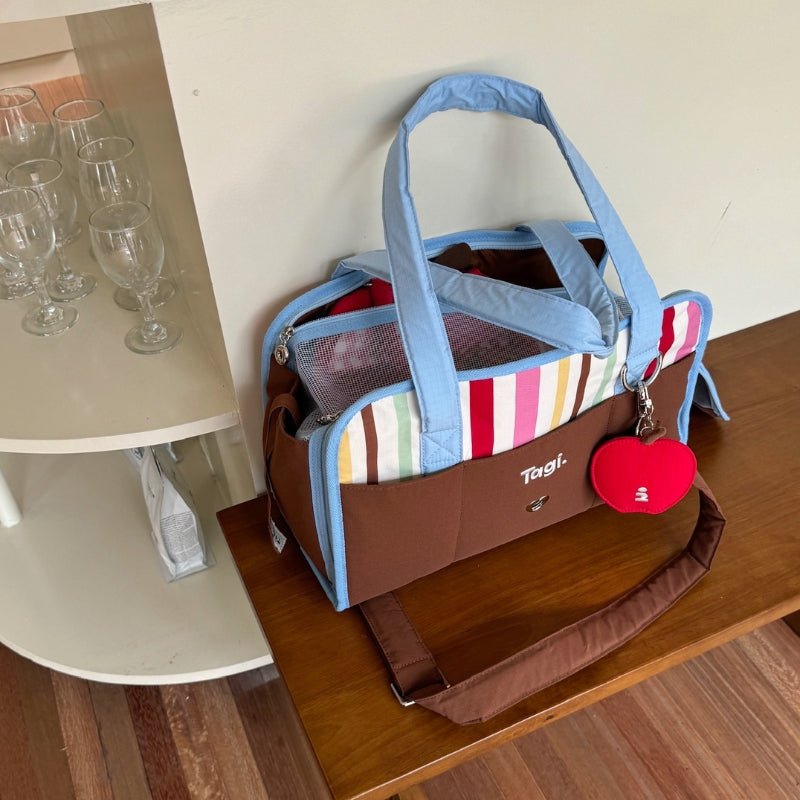 Take your furry friend on adventures with this breathable, portable pet carrier. With a stylish striped design, it's perfect for dogs and cats weighing under 8.8 lbs. Ideal for car rides and outdoor picnics, this versatile handbag can be carried or slung over your shoulder. Travel in style with your pet!