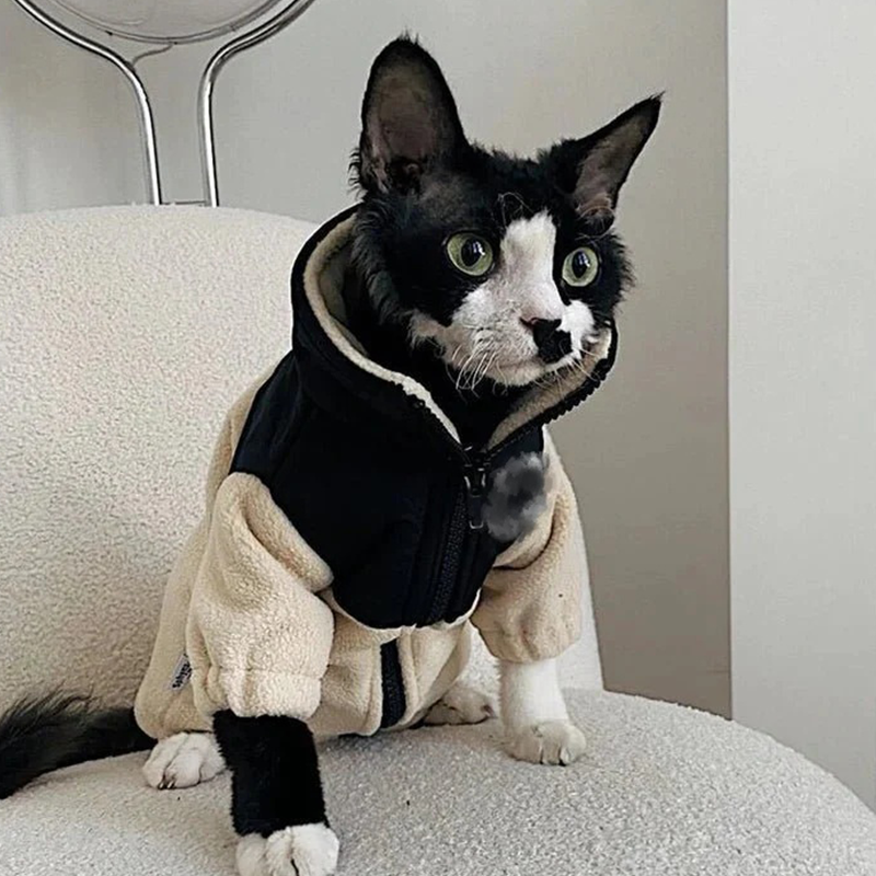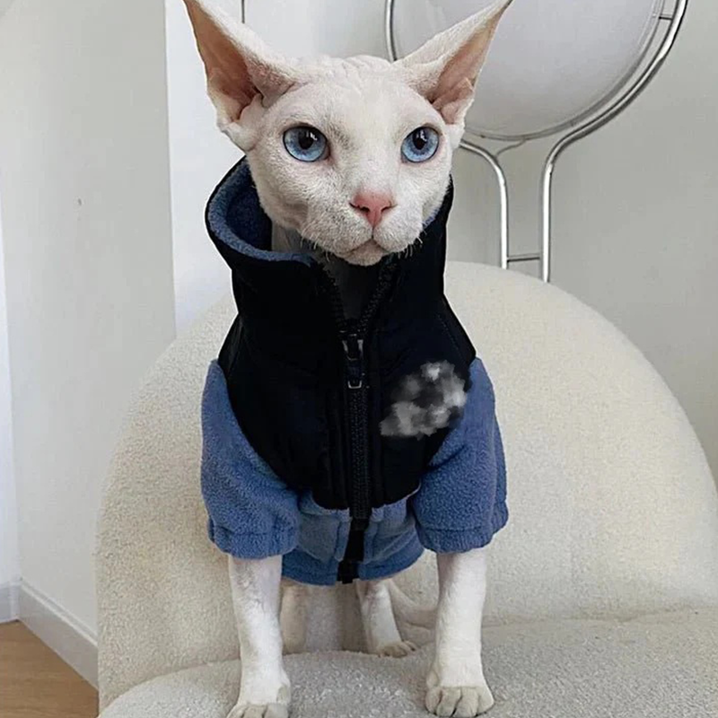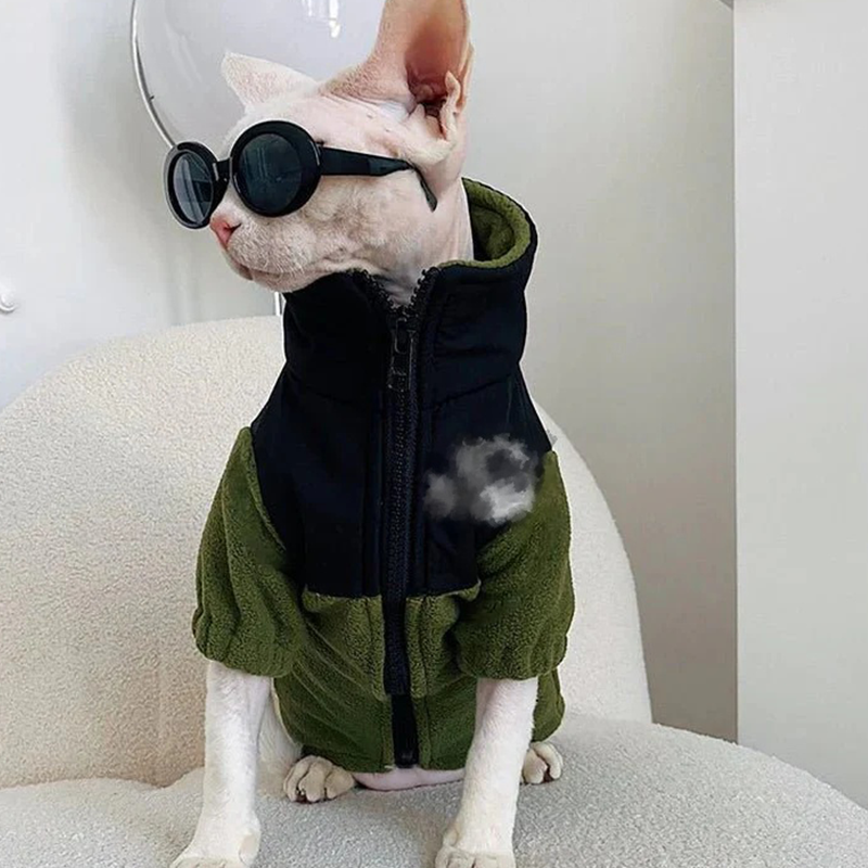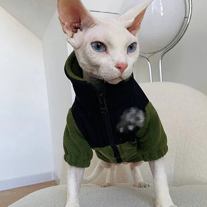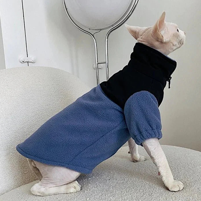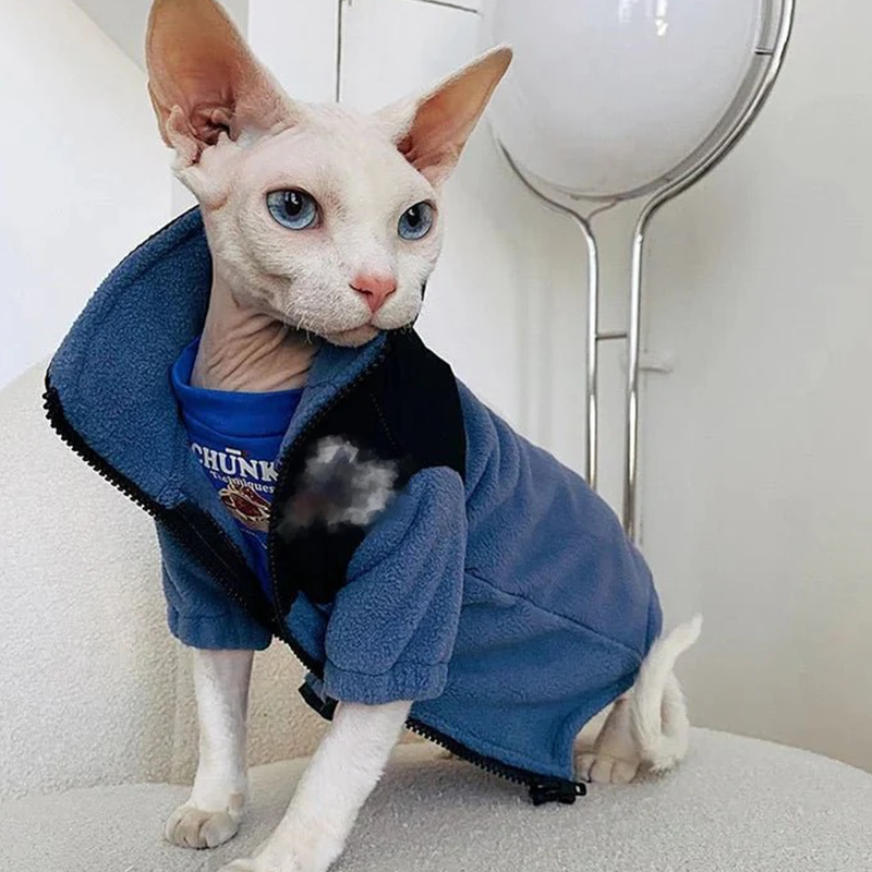 This zip jacket Hairless Sphynx cat clothes is perfect for keeping your furry friend warm and cozy. Made of plush fleece, the lightweight yet snug-fitting outfit allows for easy movement while providing optimal warmth. The design is perfect for small to medium-sized cats.