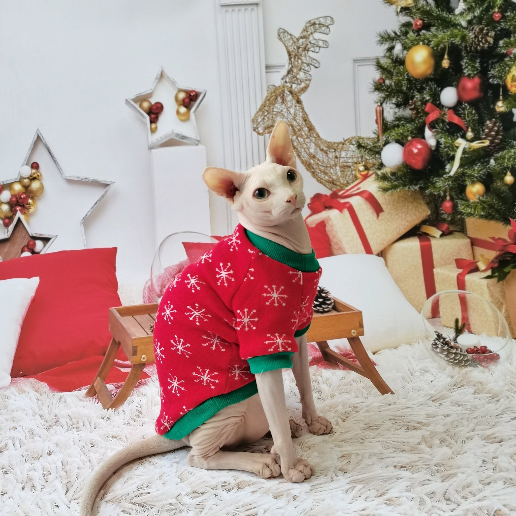 Stay cozy this winter in our Sphynx Cat Clothes Christmas Knitted Sweater Set! This stylish sweater set is designed with a festive holiday pattern, and its bright colors make it perfect for the season. The 4-legged design allows for maximum agility while keeping your cat's stomach area completely warm and insulated. With its soft, breathable material, your feline companion is sure to feel comfortable wearing it all season long.