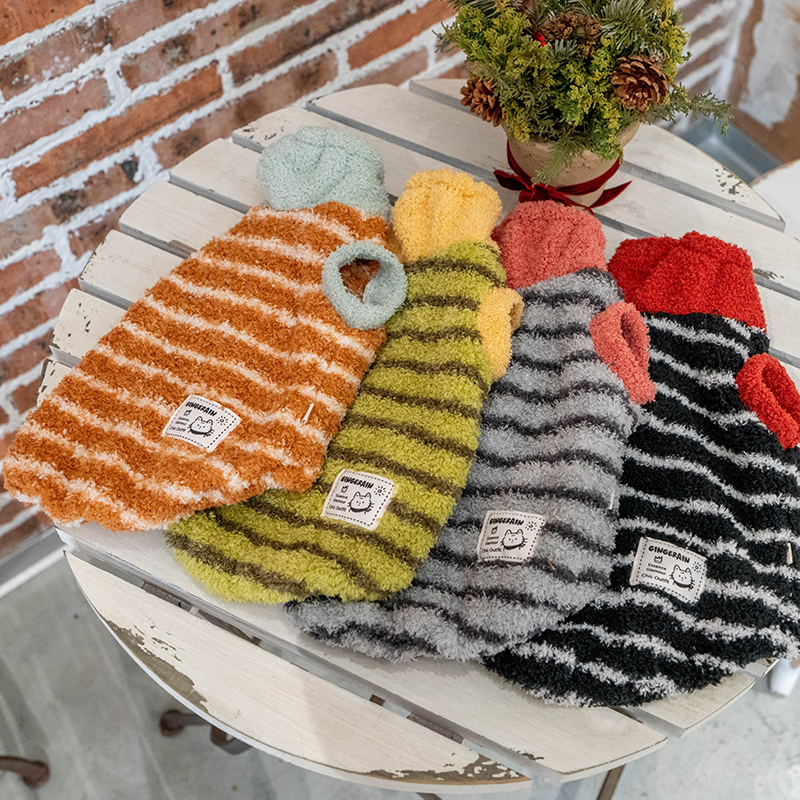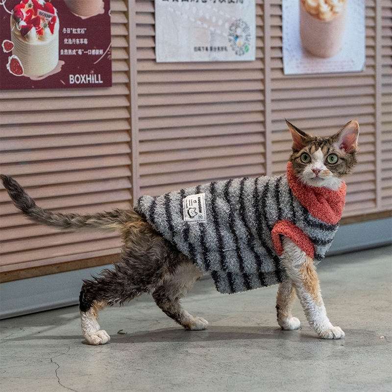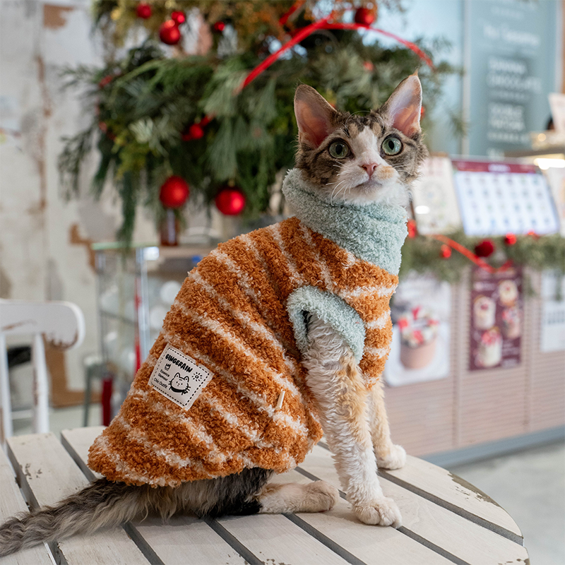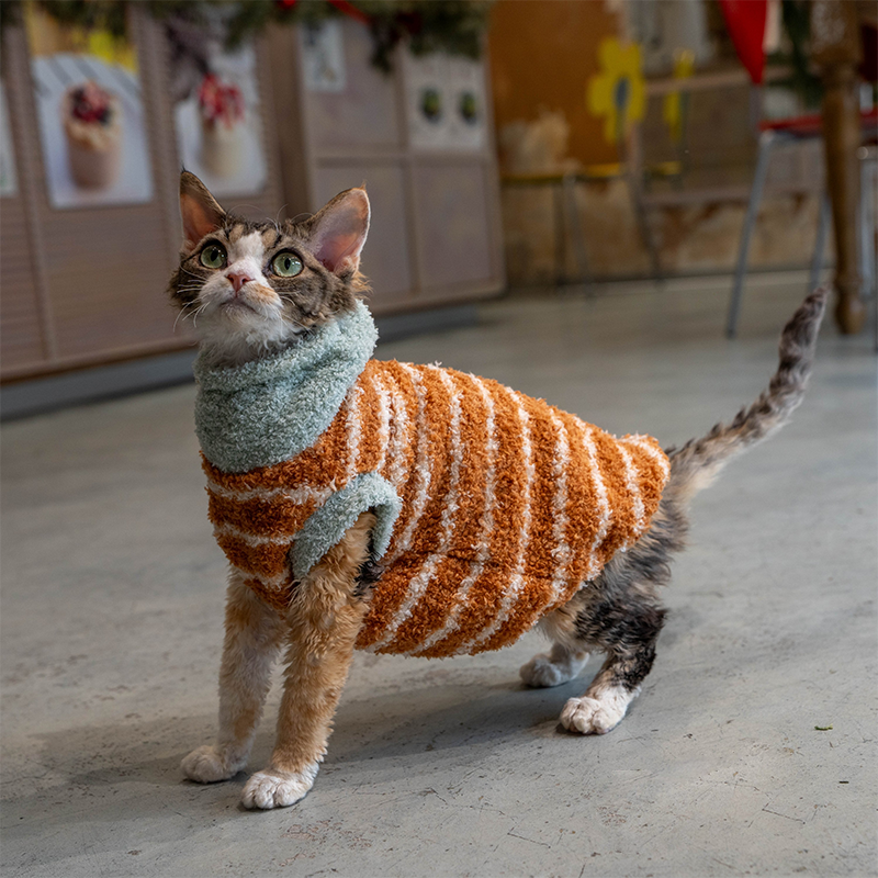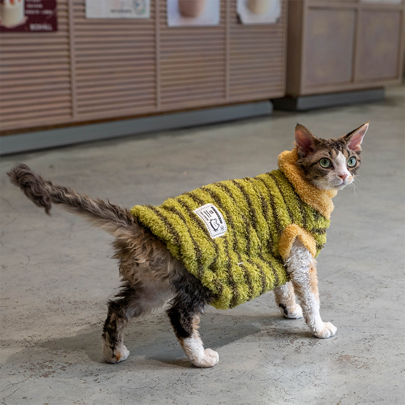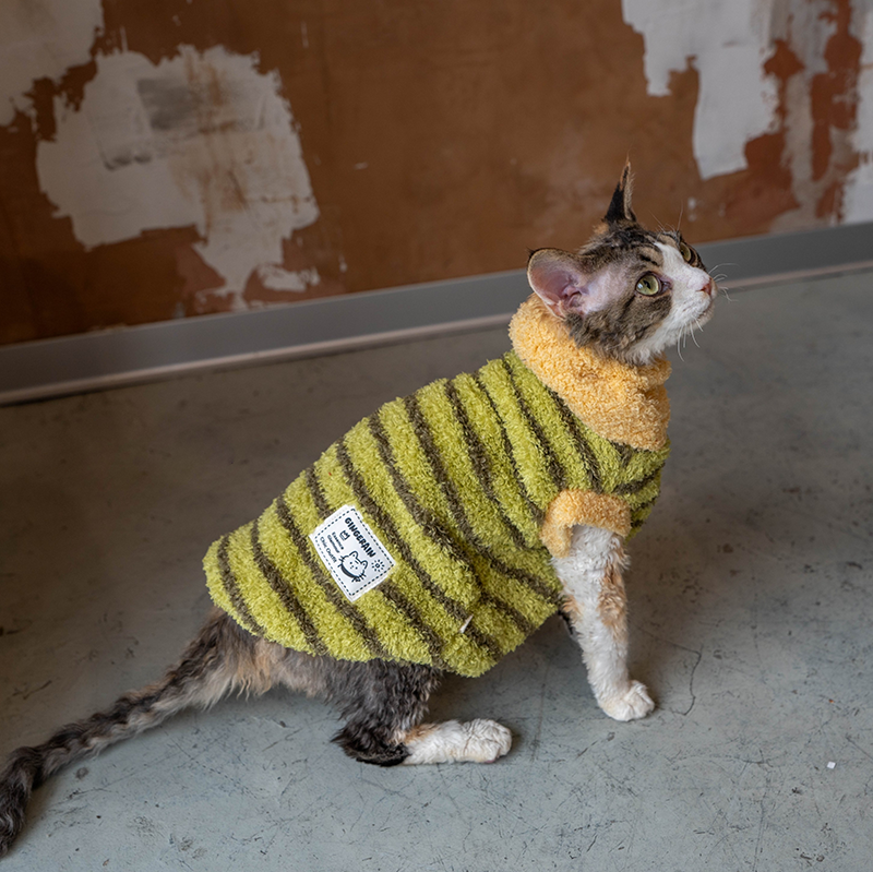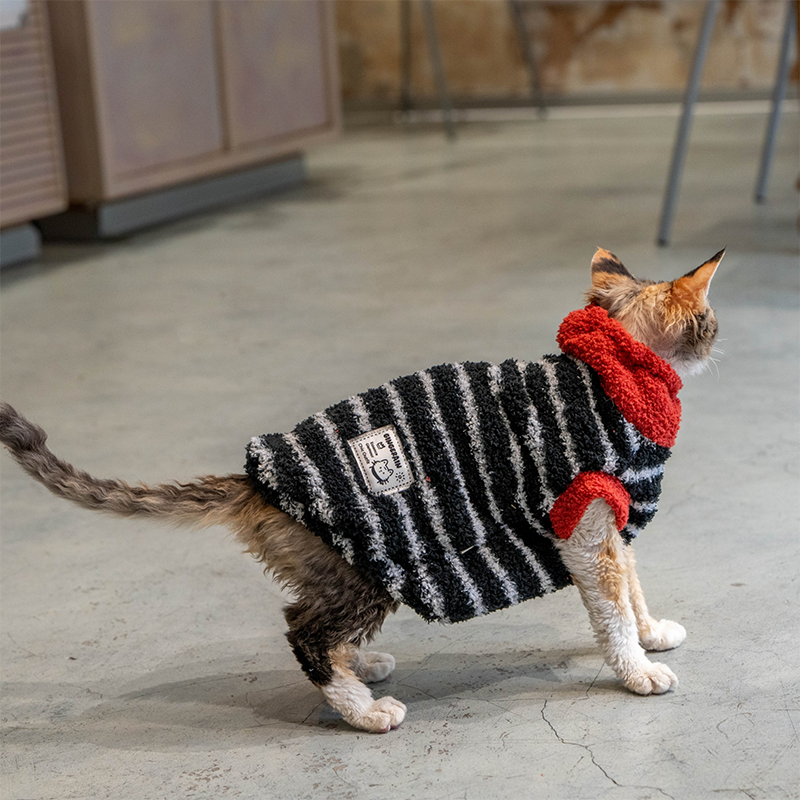 This striped fleece shirts turtleneck is designed for devon rex and sphynx cat to provide warmth and comfort during cooler seasons. Soft, plush, and lightweight, it helps retain heat while offering a snug fit that protects sensitive skin for everyday wear.