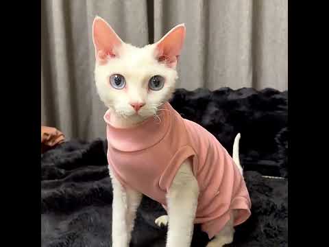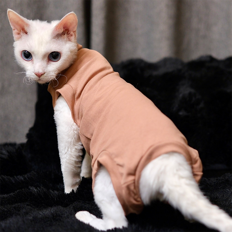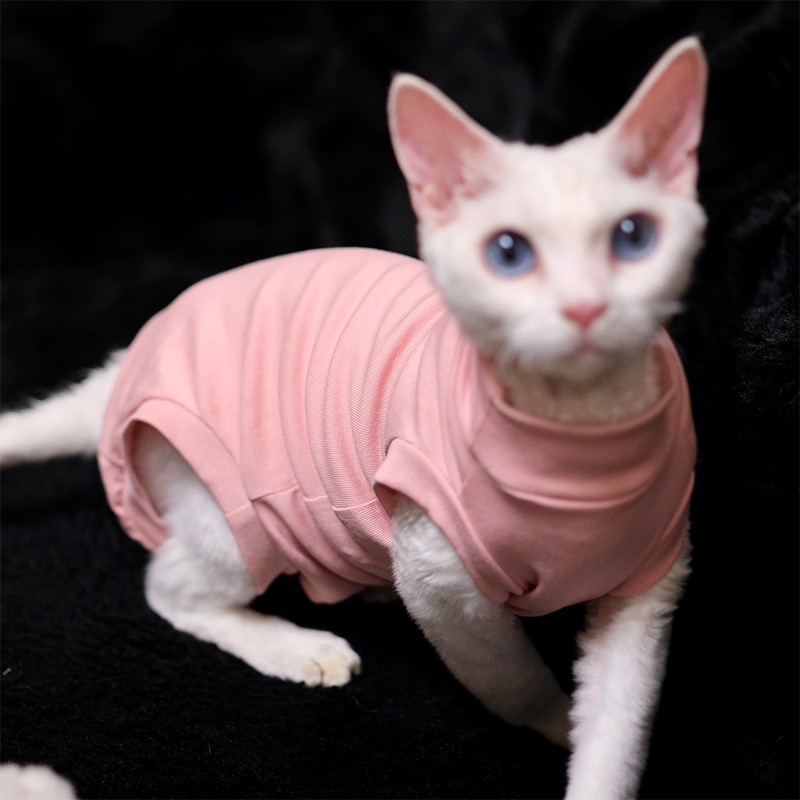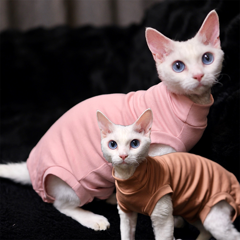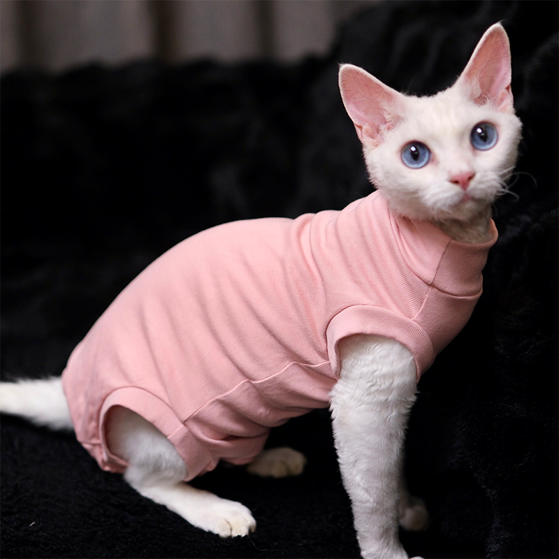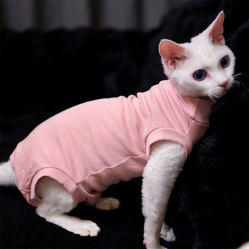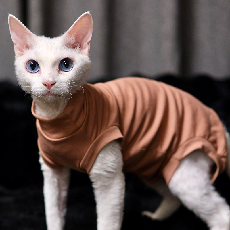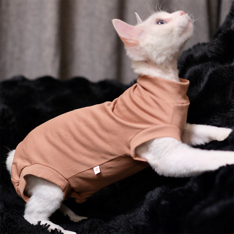 This high stretch cotton onesies is designed for devon rex and sphynx cat with a turtleneck and four leg coverage for year round comfort. Soft, breathable, and flexible, it provides gentle warmth while allowing easy movement for everyday wear in all seasons.