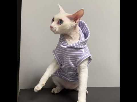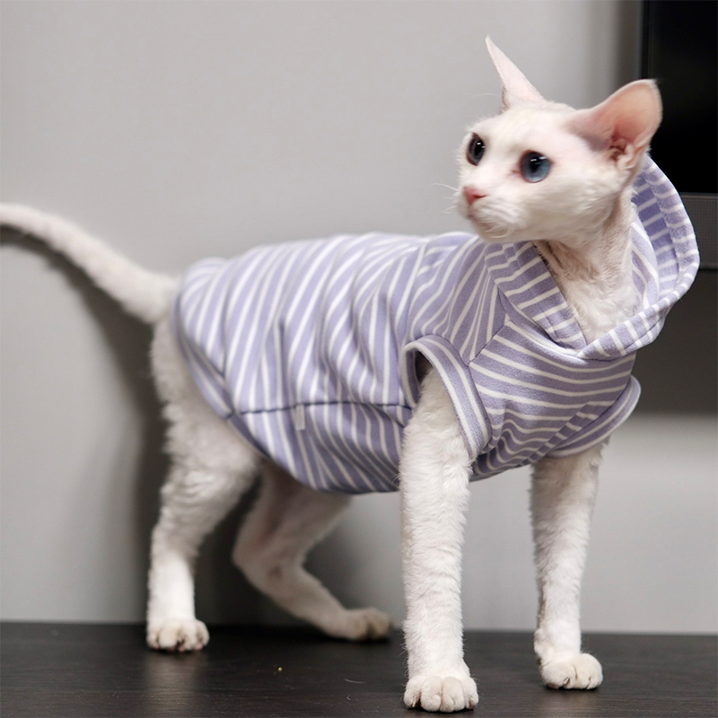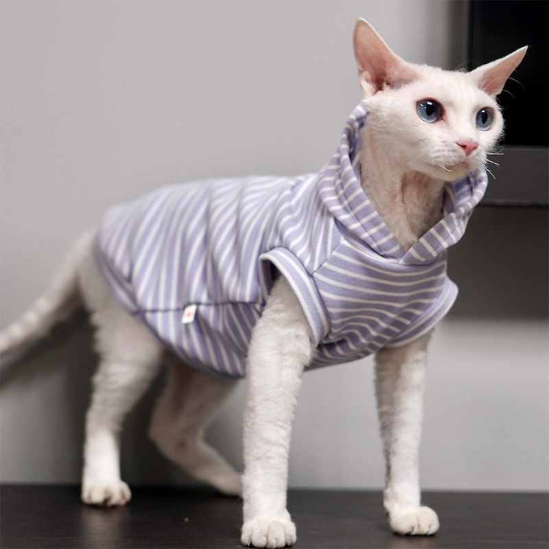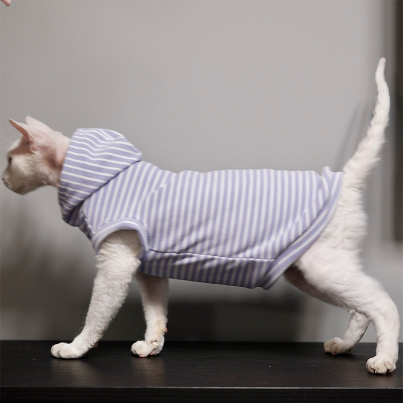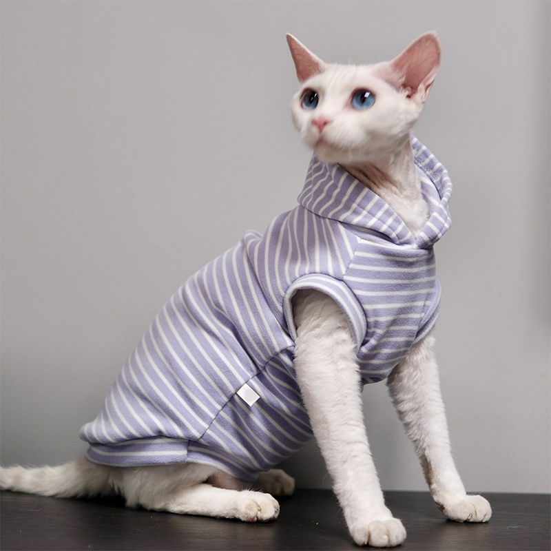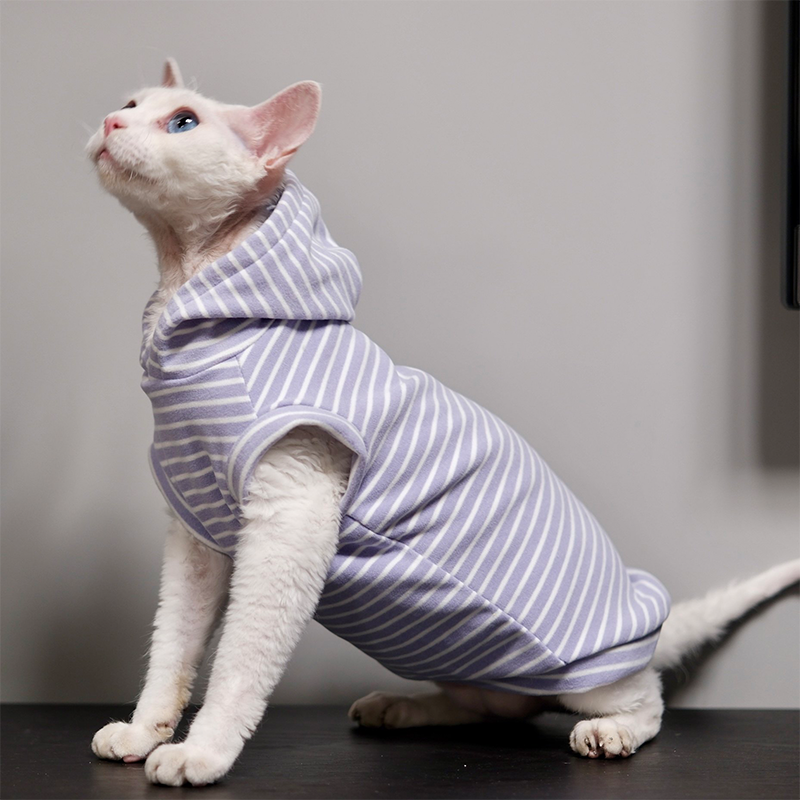 This striped sleeveless hoodie is designed for devon rex and sphynx cat with soft fleece lining for extra warmth. Thick, cozy, and comfortable, it keeps your cat protected and snug during autumn and winter while allowing freedom of movement.