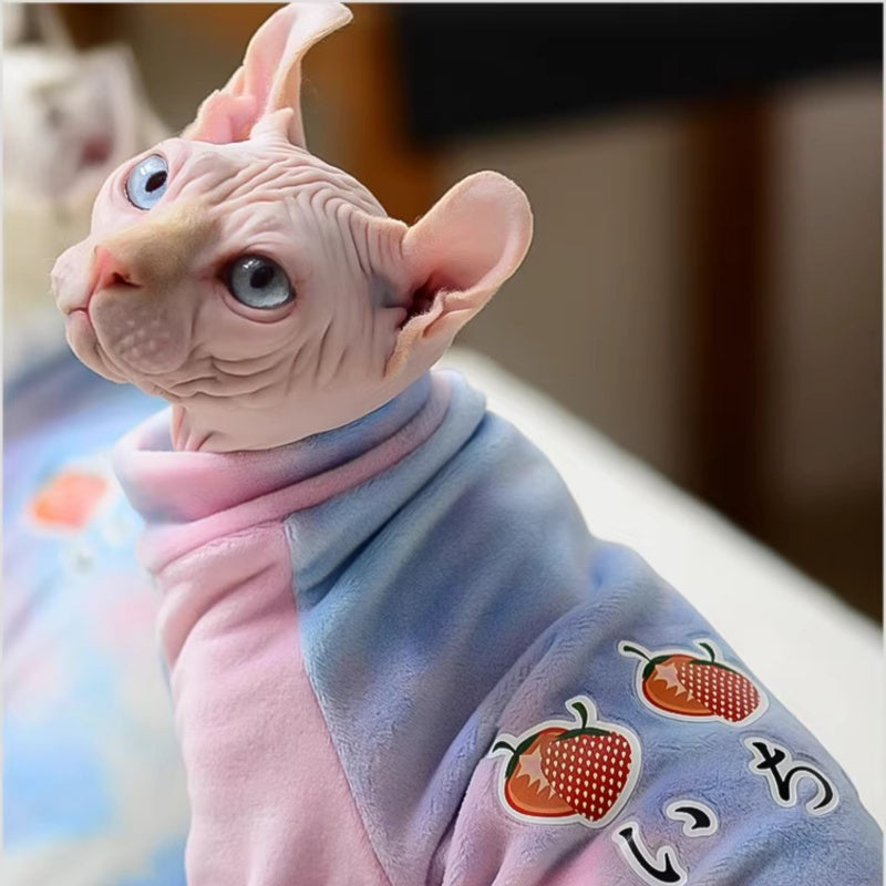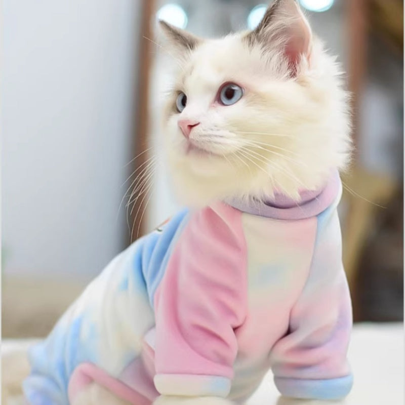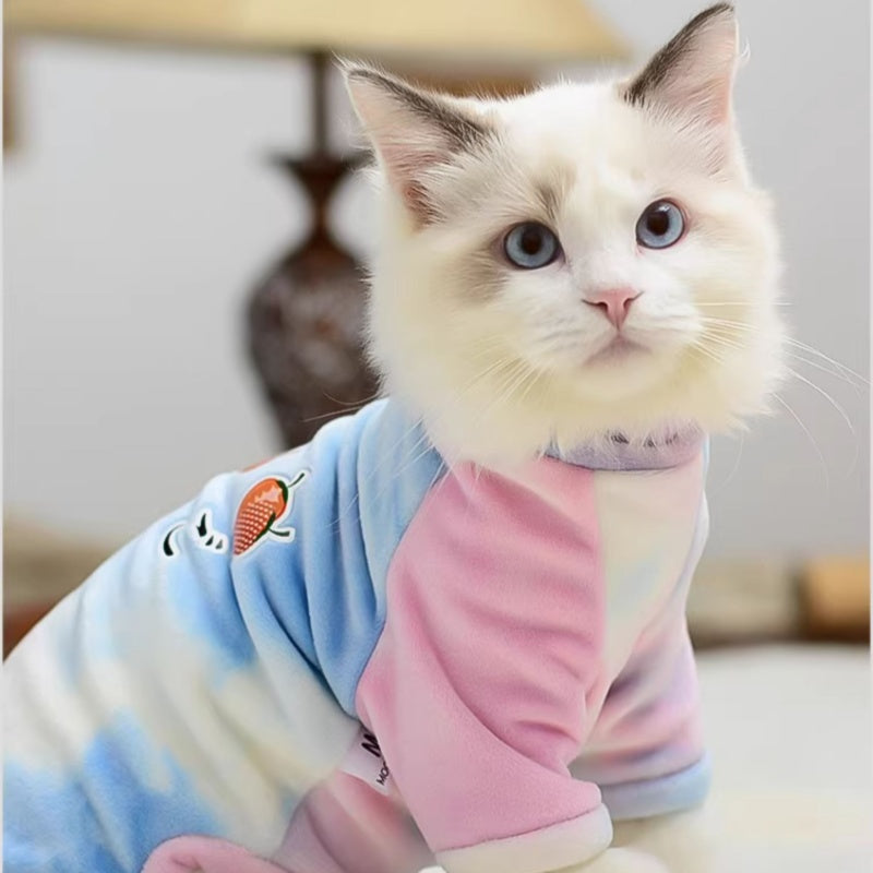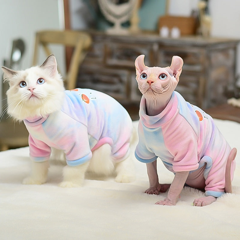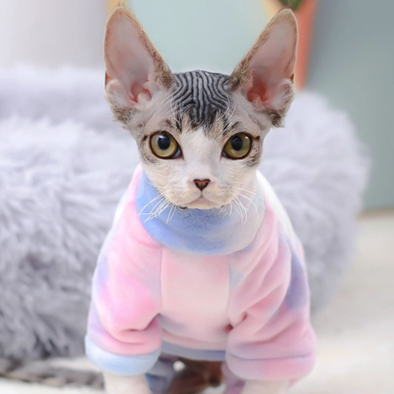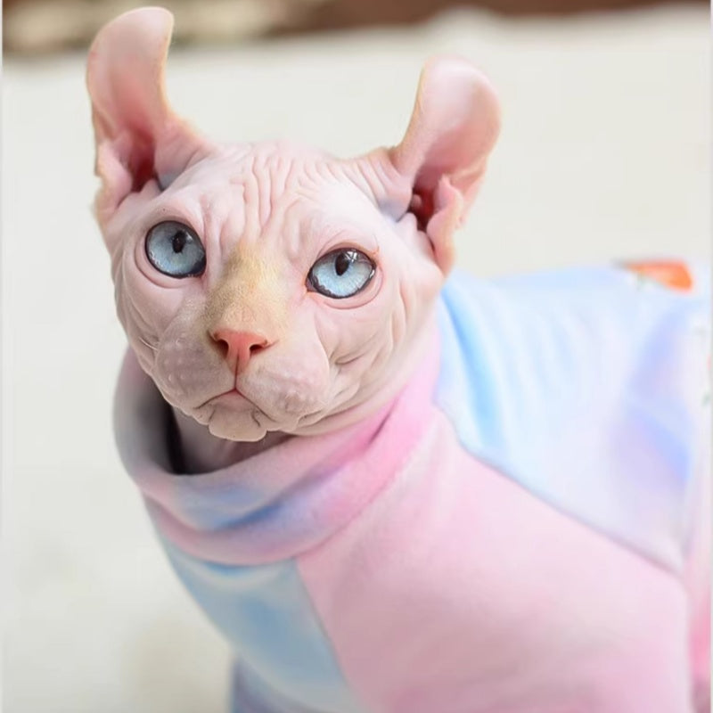 This high-quality, Sphynx Cat Clothes Tie Dye Turtleneck T-shirt is perfect for keeping your sphynx cat cozy and warm in autumn and winter. Made with German no-hair fabric and velvet lined, this t-shirt provides comfortable and breathable protection, even on cold days.