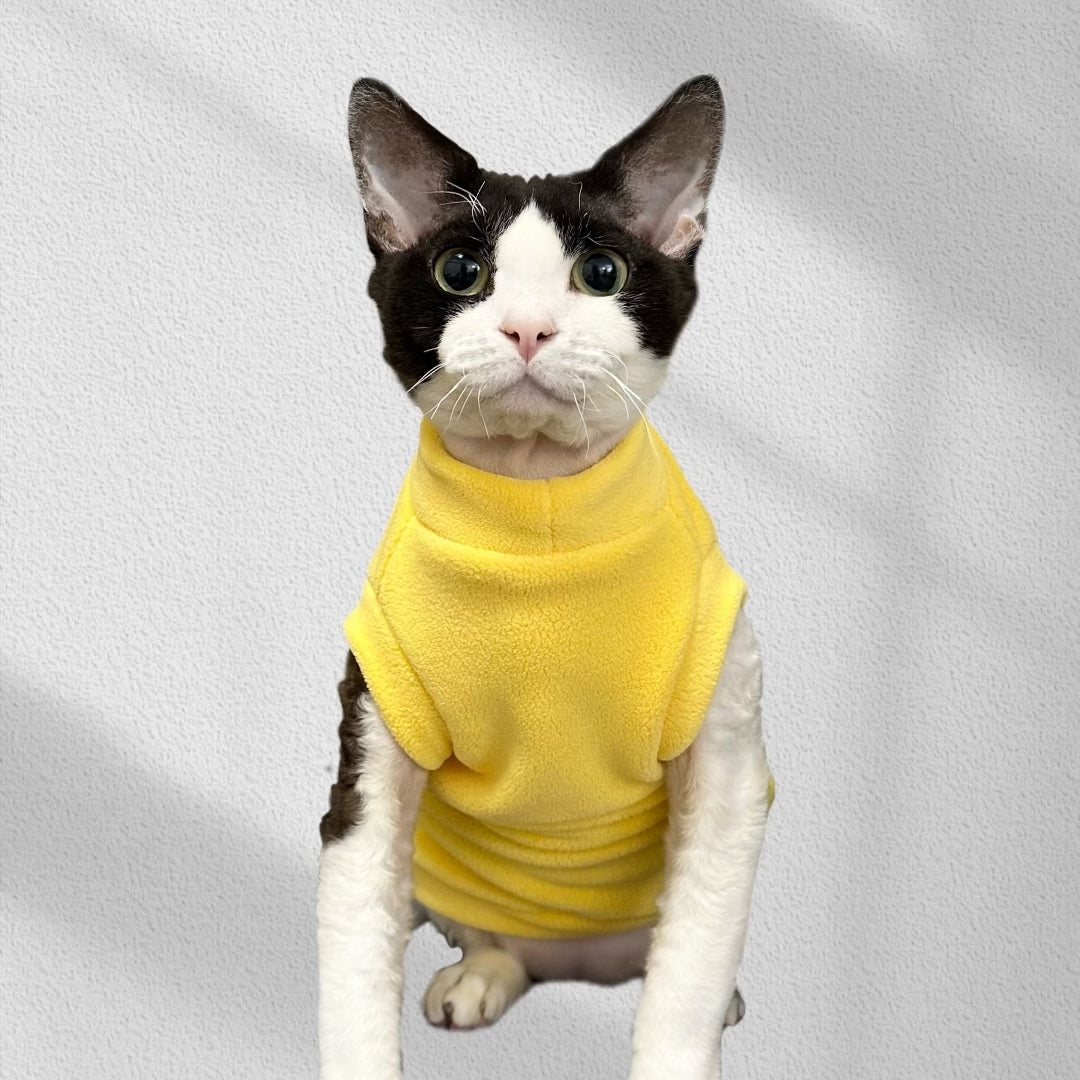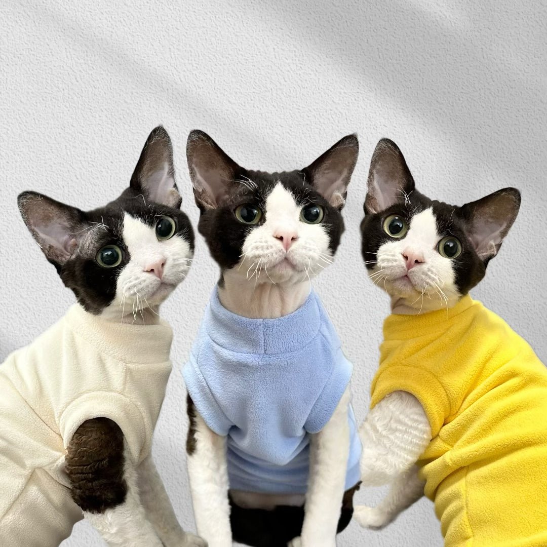 Keep your cat cozy and stylish with our Fleece Shirts Cat Pajamas. These soft and warm clothes come in multicolors and feature 7 different styles for your furry friend. Made with double-sided fleece and extra padding, your cat will stay warm and comfortable during the winter months. Perfect for any hairless or short-haired cats.
