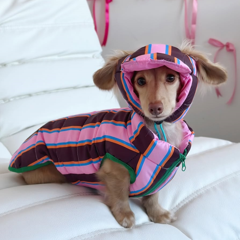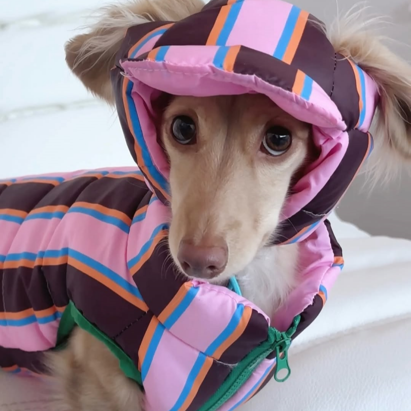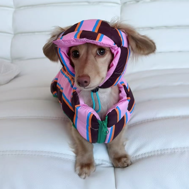 Keep your furry friend warm and stylish with our new Dachshund Clothes Dog Jacket. Made with padded cotton and complete with a matching hat, this coat features a fun rainbow stripe design. Perfect for chilly days, your dog or cat will love this cute and cozy outfit.