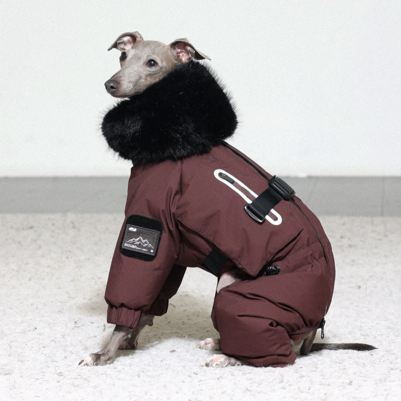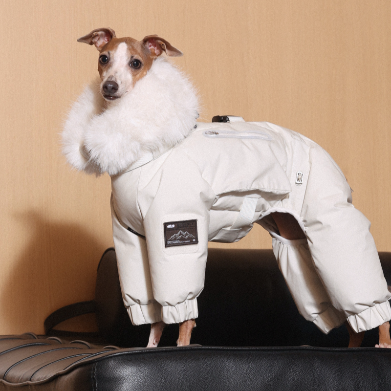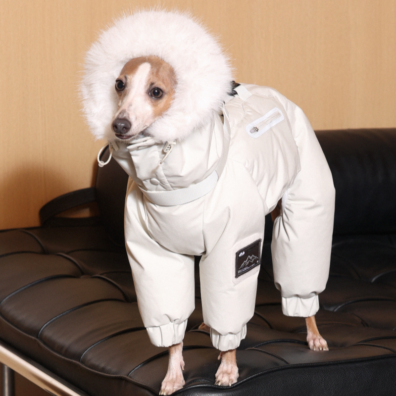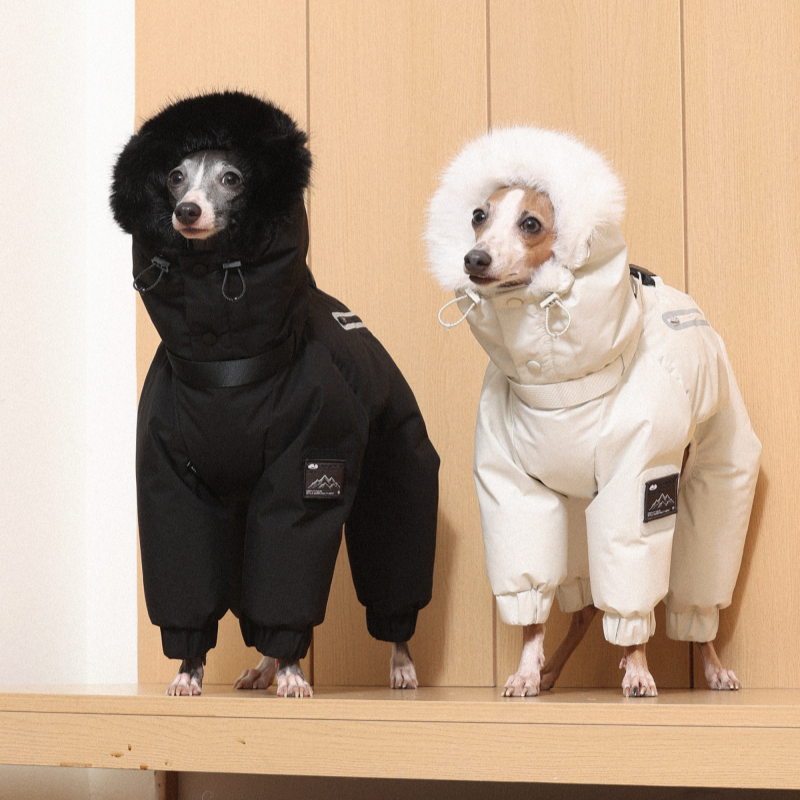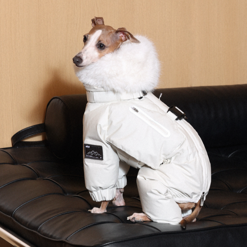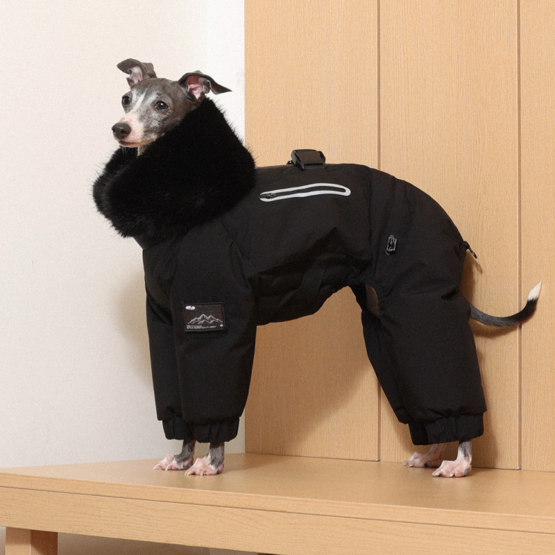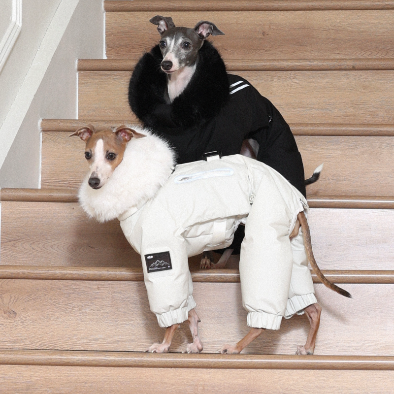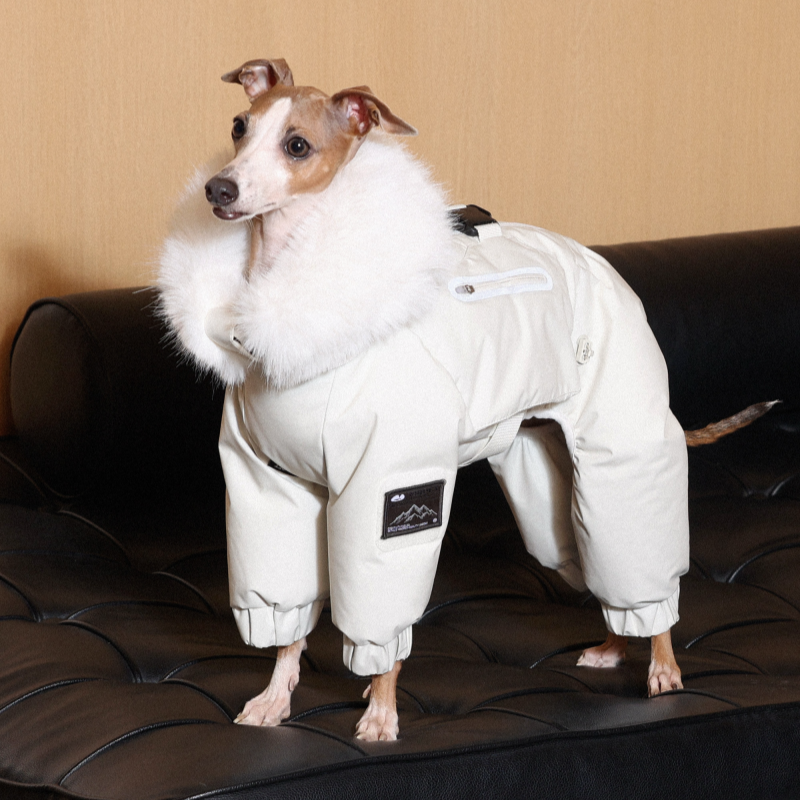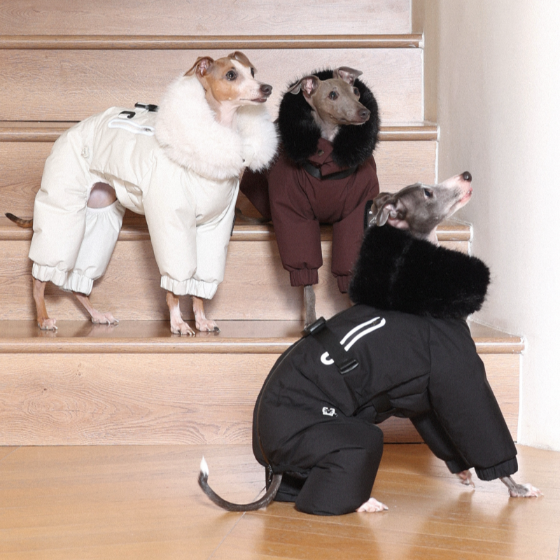 Keep your Italian Greyhound or Whippet warm and stylish this winter with this premium down Snowsuits. Featuring a cozy fur collar and thick insulation, this four-legged jacket provides ultimate warmth and comfort. Perfect for cold weather walks, it offers both fashion and functionality for your dog.