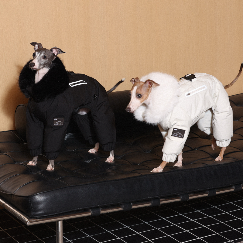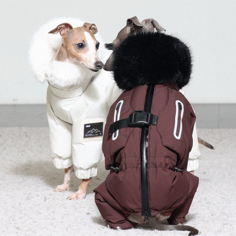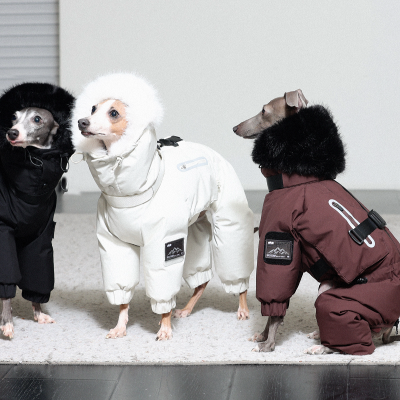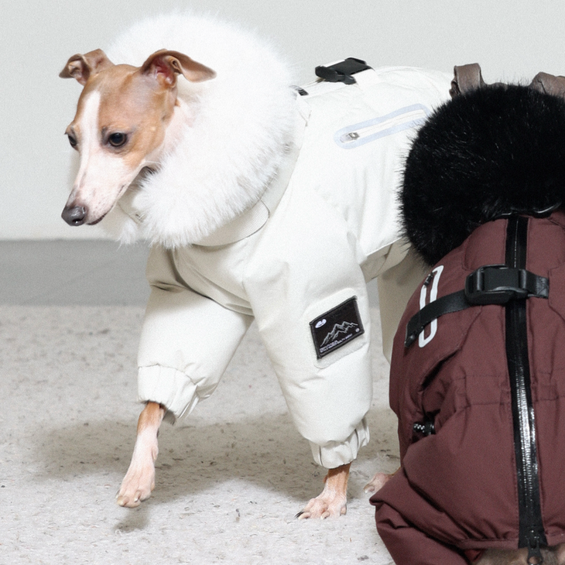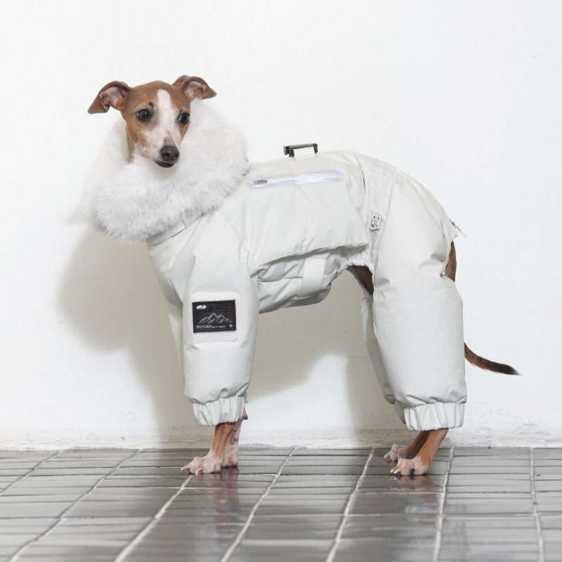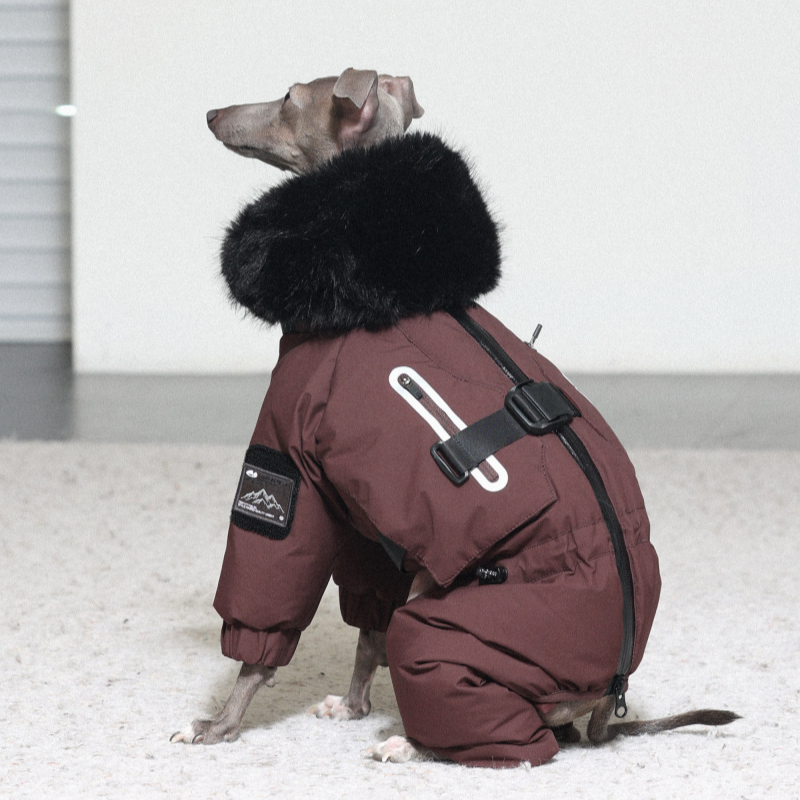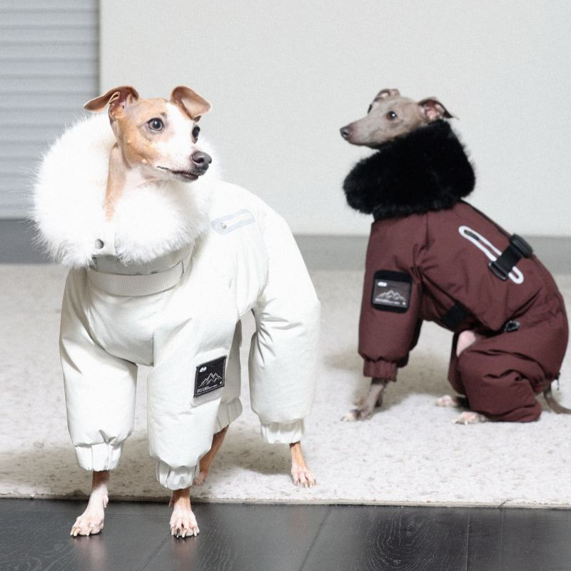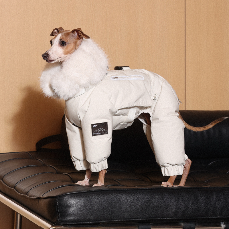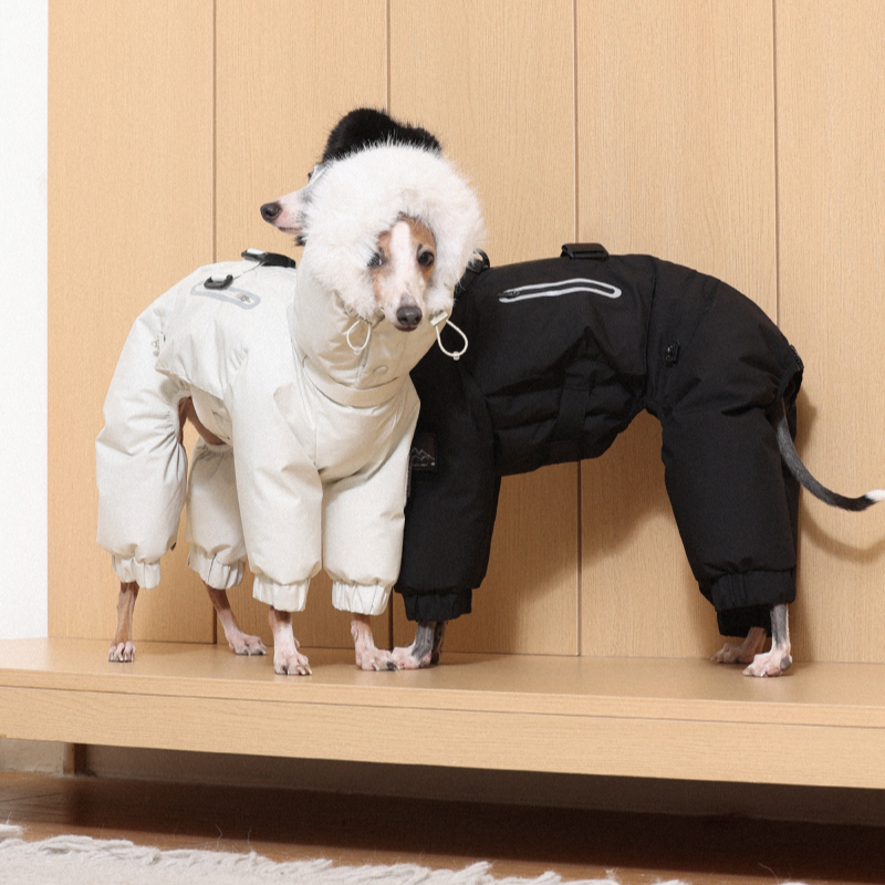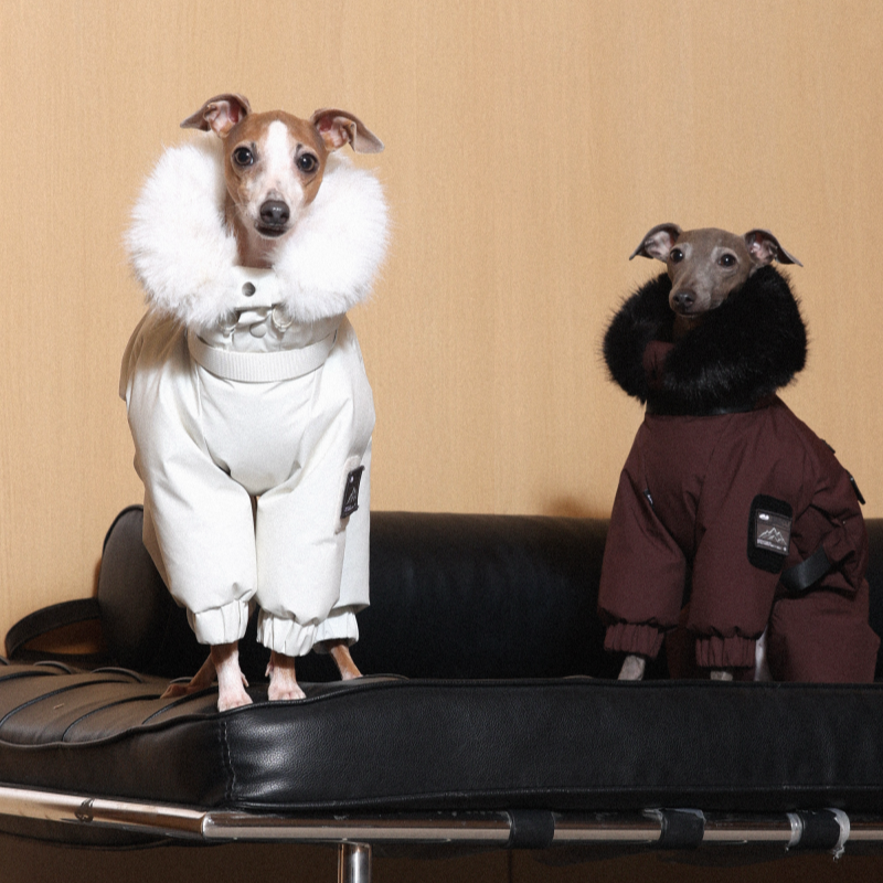 Keep your Italian Greyhound or Whippet warm and stylish this winter with this premium down Snowsuits. Featuring a cozy fur collar and thick insulation, this four-legged jacket provides ultimate warmth and comfort. Perfect for cold weather walks, it offers both fashion and functionality for your dog.