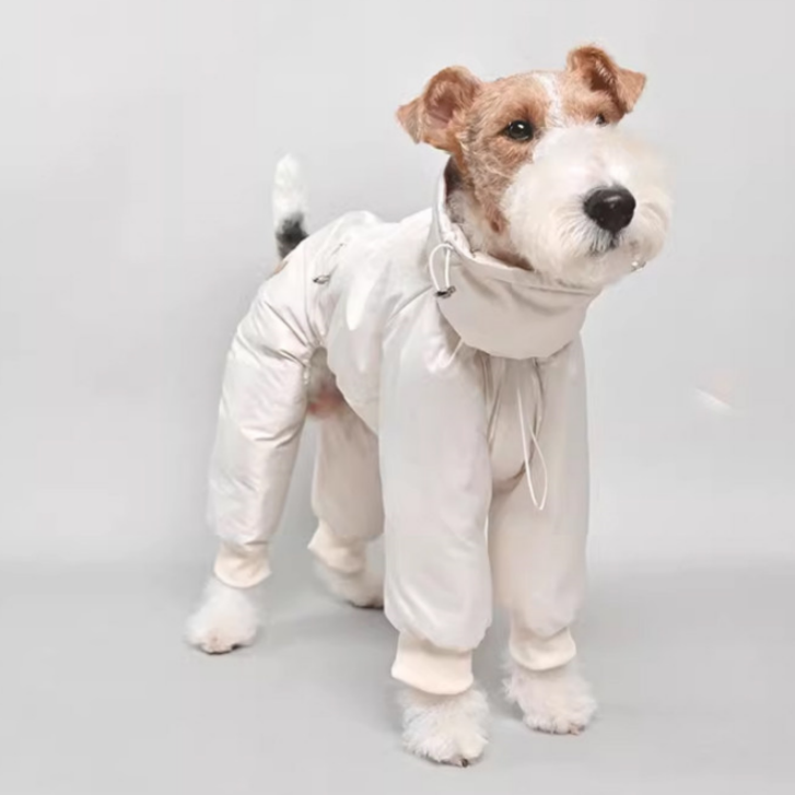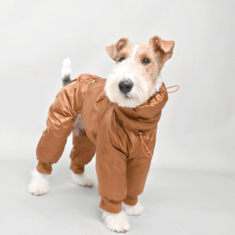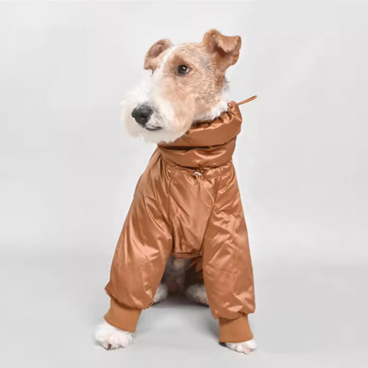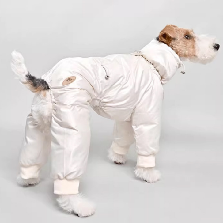 This winter puffer dog four leg down snowsuits is designed for small dogs needing full body warmth The insulated design helps retain heat while allowing comfortable movement perfect for cold weather daily wear.