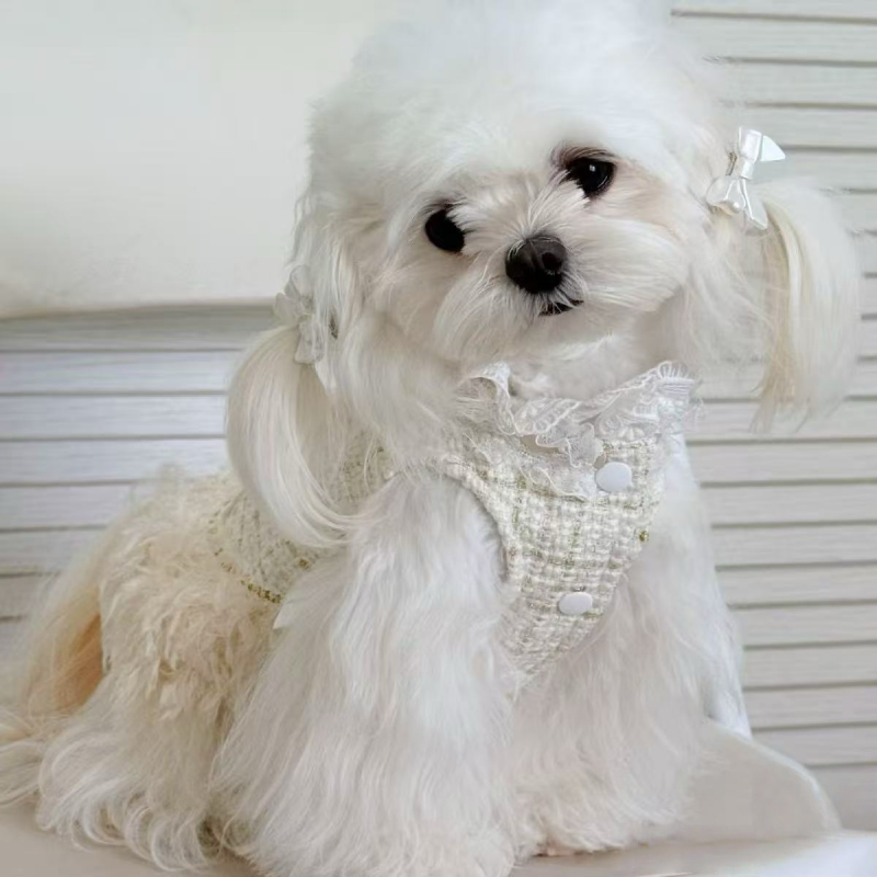 This autumn and winter couture style flower princess dresses designed for small medium dogs who enjoy refined fashion and seasonal warmth. Inspired by classic luxury aesthetics, it features a structured yet comfortable fit that balances elegance and wearability. The dress coat design adds a polished look while providing light insulation, making it suitable for festive occasions special outings and stylish everyday wear.