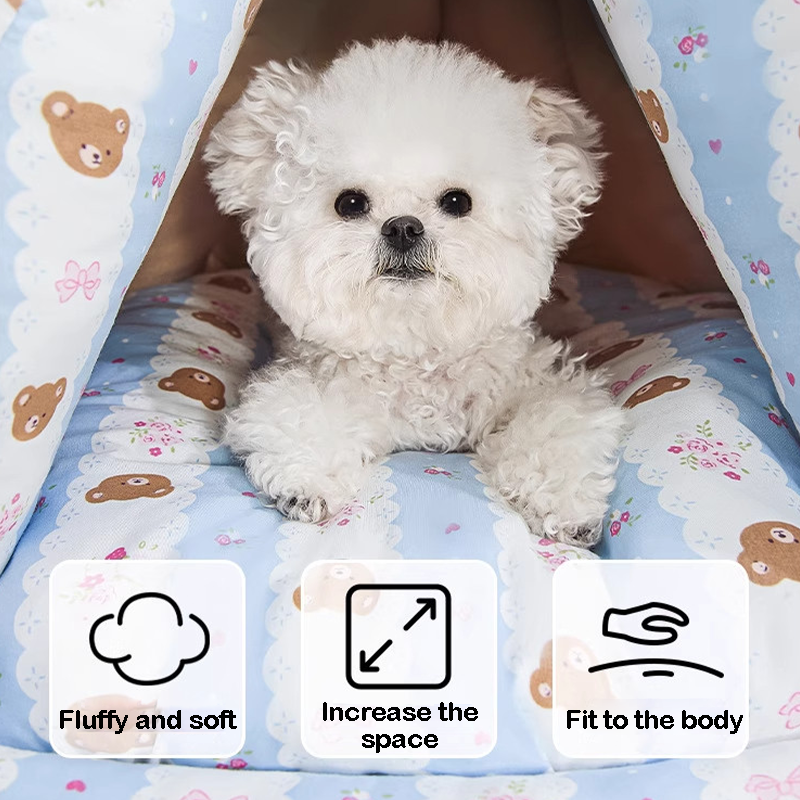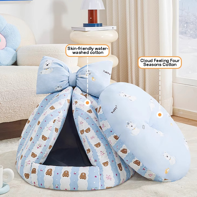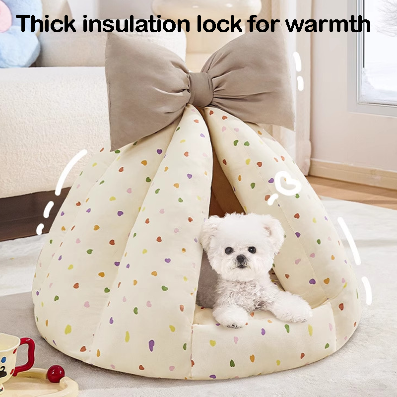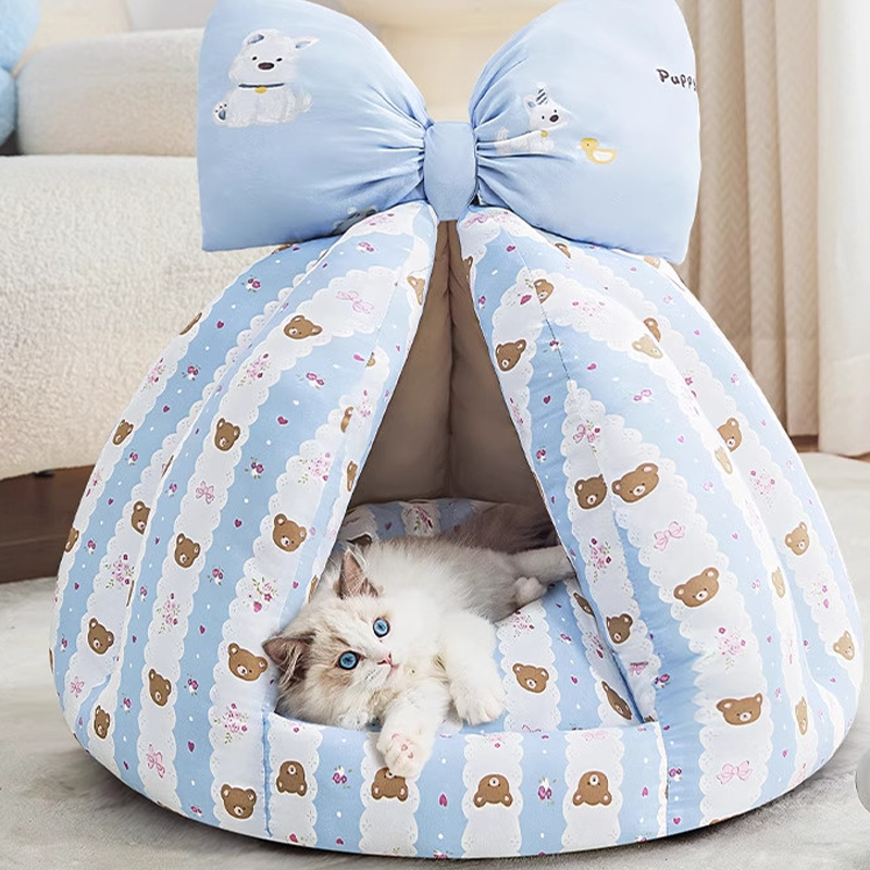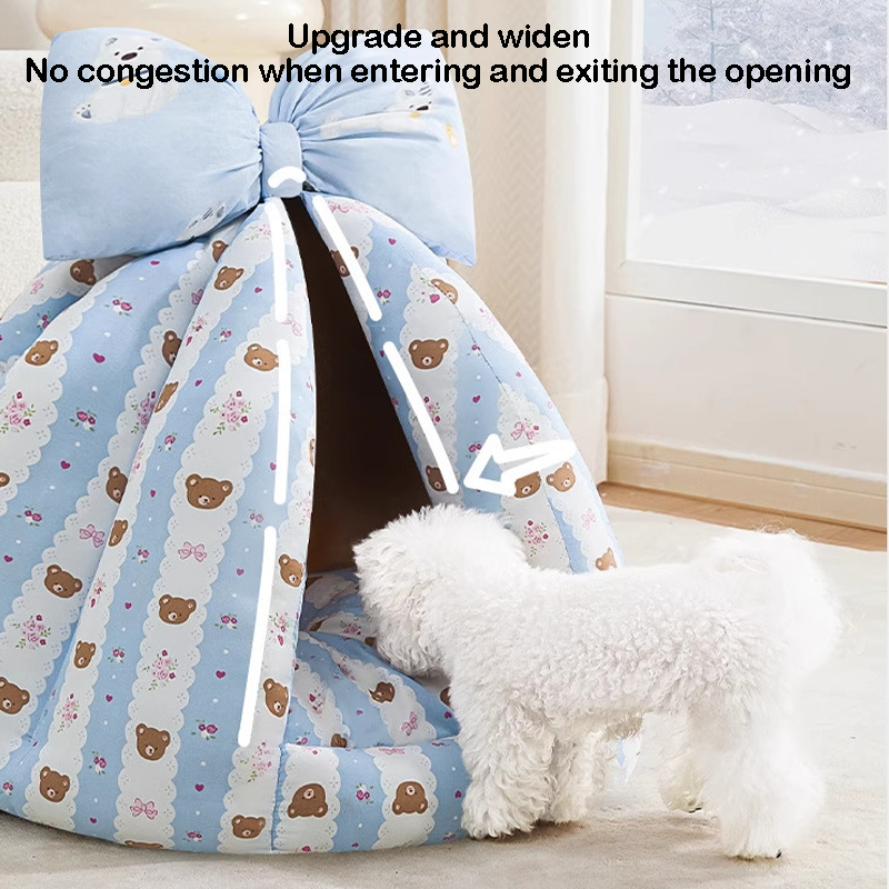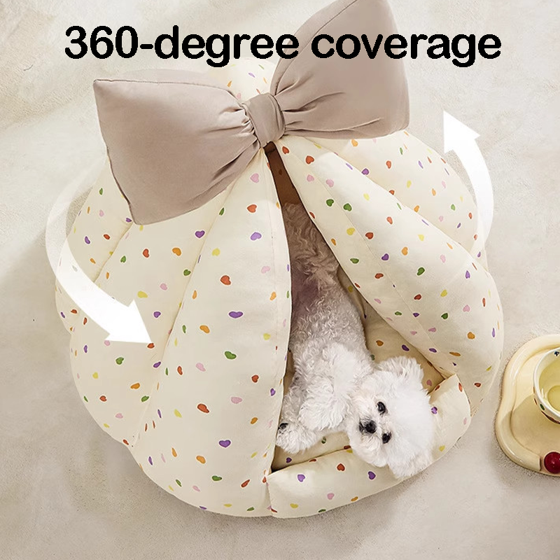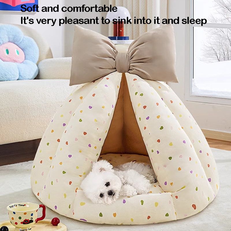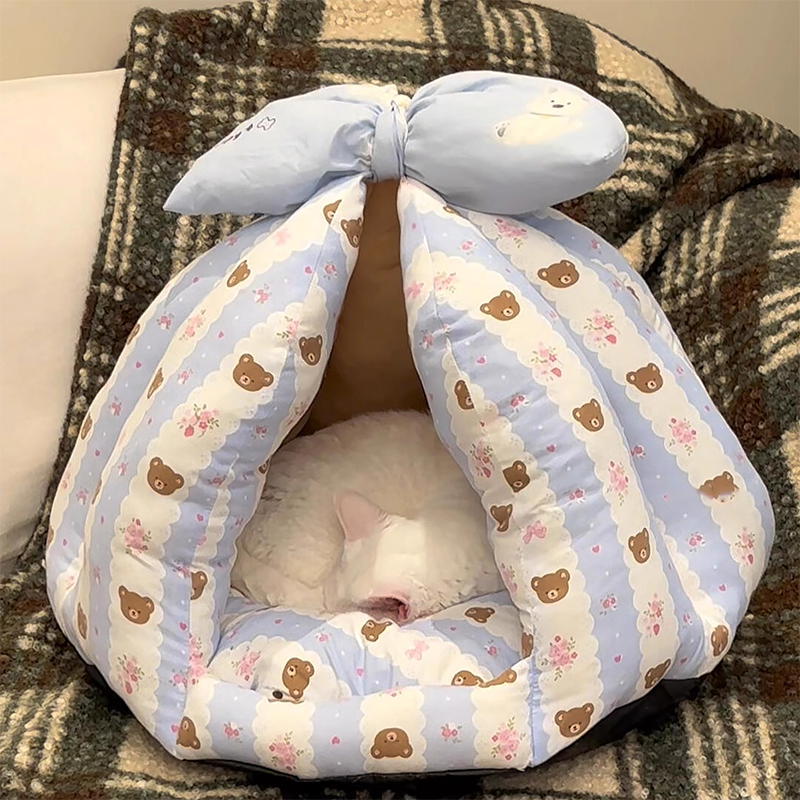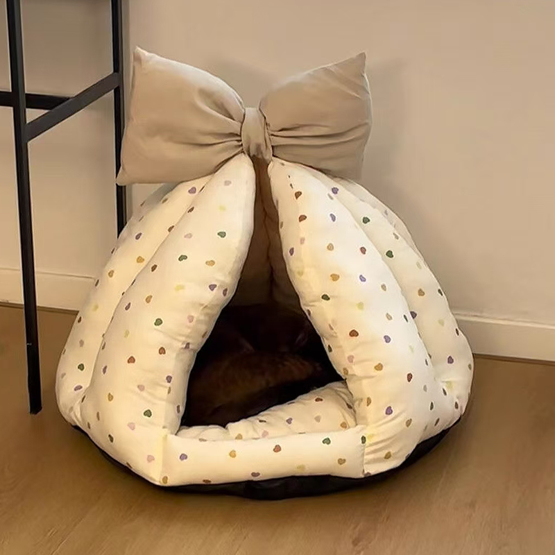 This bowknot-decorated enclosed pet bed is designed to provide a cozy and secure resting space for your cat or dog. The fully enclosed design offers a sense of safety, making it ideal for pets who enjoy curling up while sleeping. Made from soft and plush materials, it provides gentle support and lasting comfort. The cute bowknot adds a playful and stylish touch to your home, creating an inviting spot where your pet can relax, sleep, and feel protected every day.