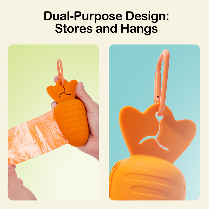 This carrot-shaped dog waste bag dispenser features a fun and playful design that makes daily walks more enjoyable. Compact and lightweight, it is easy to carry and convenient for outdoor use. It securely holds waste bags and allows quick dispensing whenever needed, helping you clean up efficiently during walks. The portable design can be attached to leashes, backpacks, or belts, ensuring it is always within reach. Durable and practical, this dispenser combines functionality with a cute appearance, making it a useful accessory for responsible pet owners.