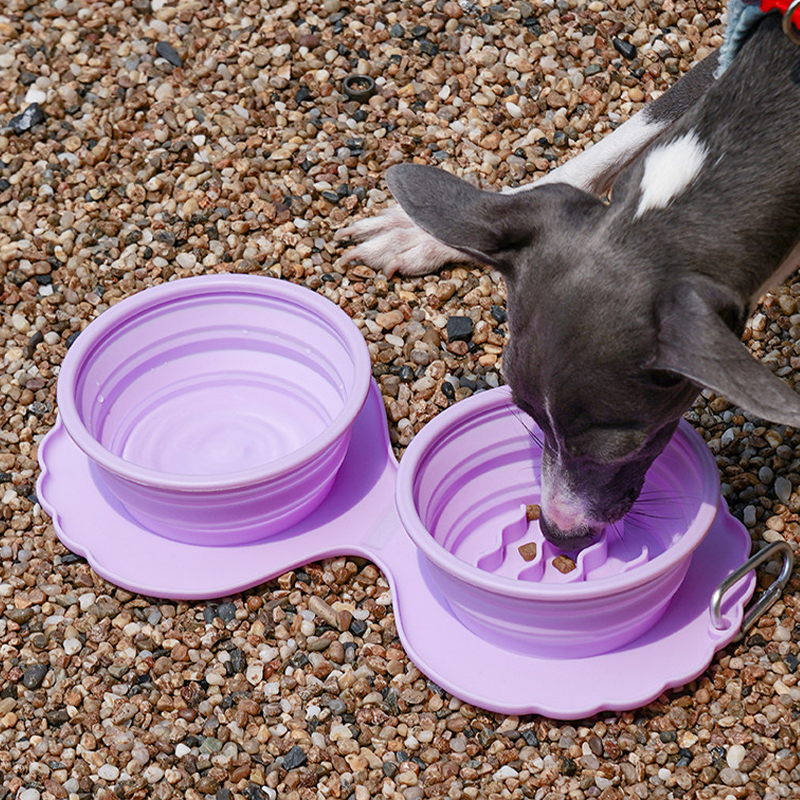 This shell-shaped double collapsible pet bowl is designed for convenient feeding and hydration during outdoor activities. Featuring a dual-bowl design, it allows you to serve both food and water at the same time, making mealtime easier while traveling. Made from durable, food-grade silicone, the bowls fold flat for compact storage and easy portability. Lightweight and practical, it is perfect for walks, hiking, road trips, and everyday outings with your dog. The cute shell-inspired shape adds a playful touch while remaining easy to clean and reusable for daily use.