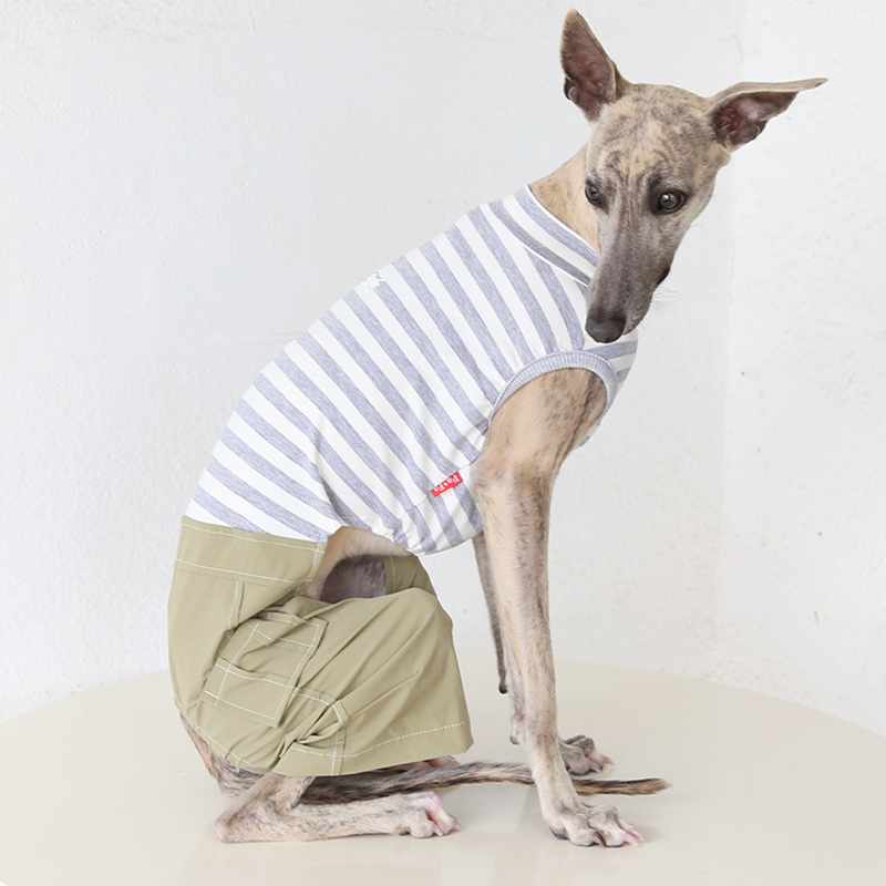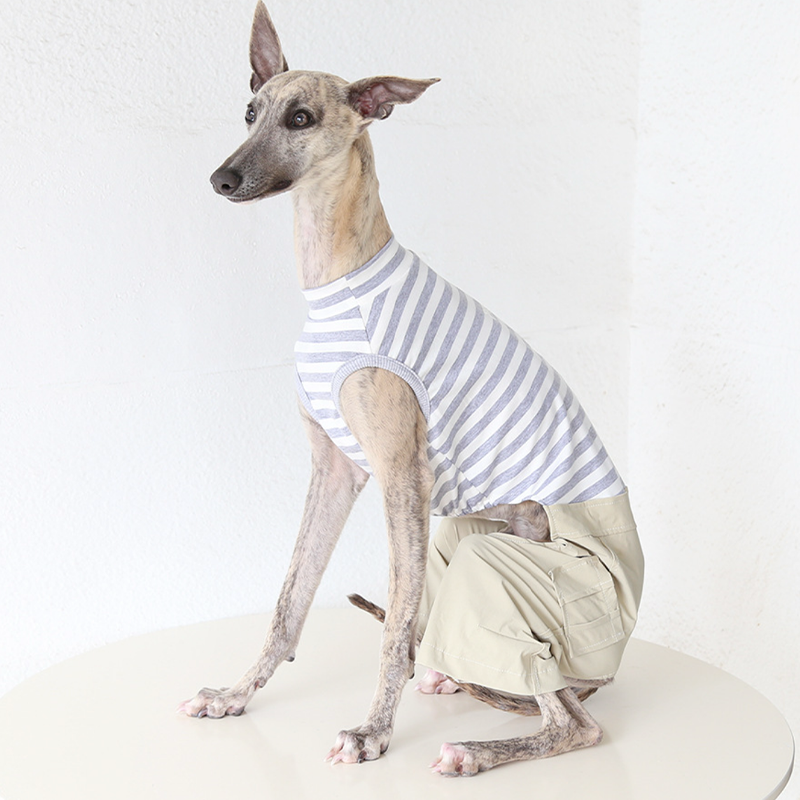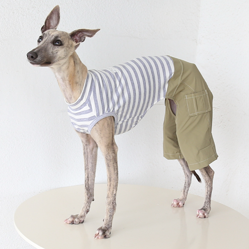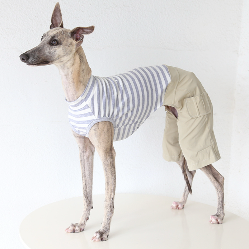 Designed for Italian Greyhounds and Whippets, this striped dog onesies provides comfortable full body coverage for everyday wear. The soft fabric feels gentle on the skin while offering lightweight warmth and flexibility. The four leg design helps keep your dog cozy while allowing natural movement, making it suitable for lounging at home or going out for walks. Tailored for the slender body shape of sighthounds, this striped onesies combines comfort, style, and practicality for daily use.