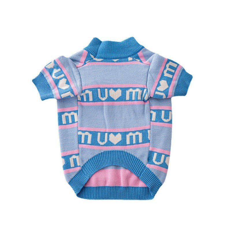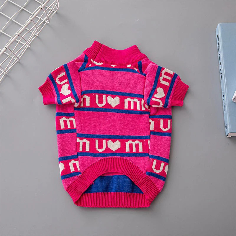 Elevate your pup's style with our miumiu Style Knit Sweater Dog Clothes. Made for winter warmth, this designer knit will keep your furry friend cozy while making a statement. Perfect for small dogs like French Bulldogs and Corgis, and even cats who like to take fashion risks.