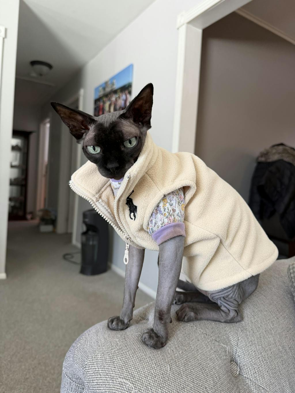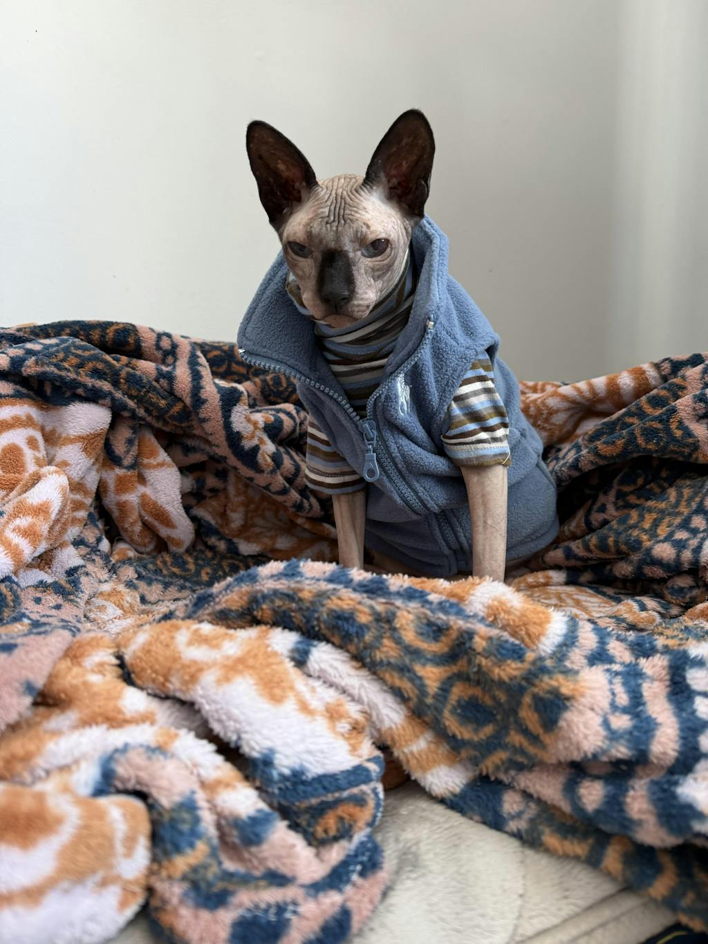 Stay warm and stylish with our Fleece Cat Zip Vest Coat for Sphynx cats. Designed with a sleeveless and thick style, this coat will keep your cat cozy during chilly seasons. Plus, it's a trendy new addition to your cat's wardrobe.