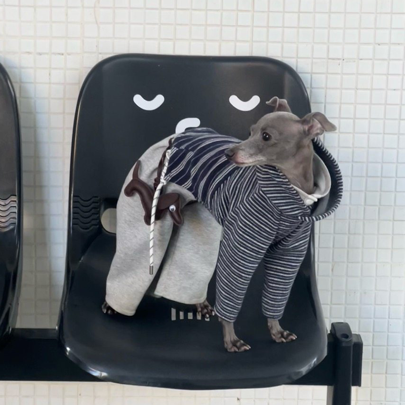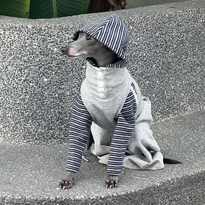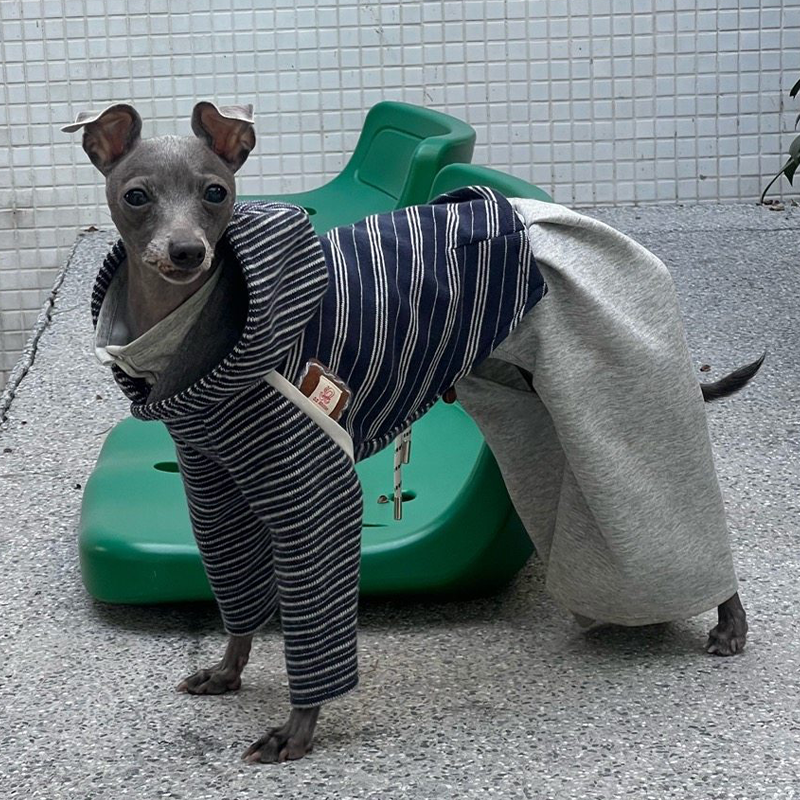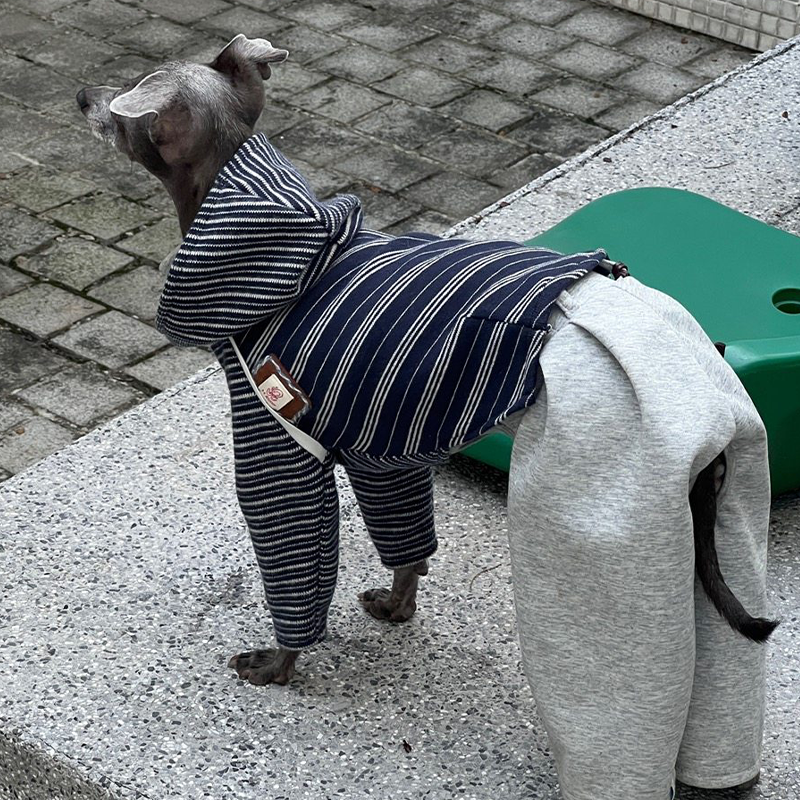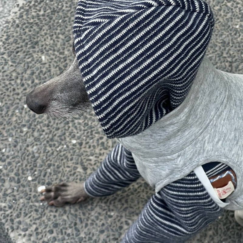 This asymmetrical patchwork striped hoodie is designed for Italian Greyhound and Whippet dogs to stay warm and stylish during autumn and winter. Featuring a unique mixed stripe design with a hooded silhouette, it offers comfortable warmth, flexible movement, and a modern look, making it suitable for daily wear and casual outdoor walks.