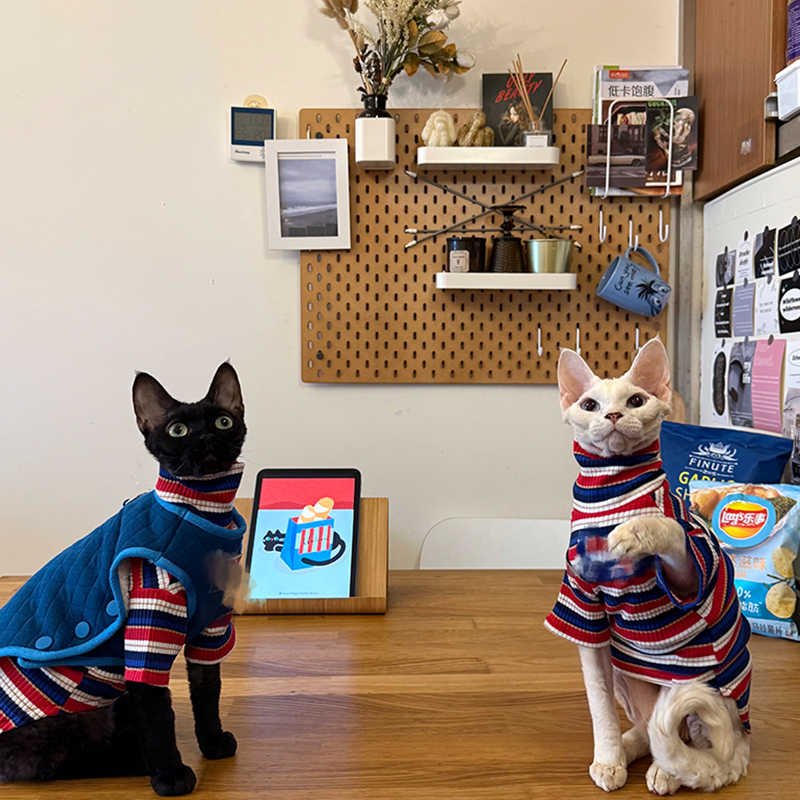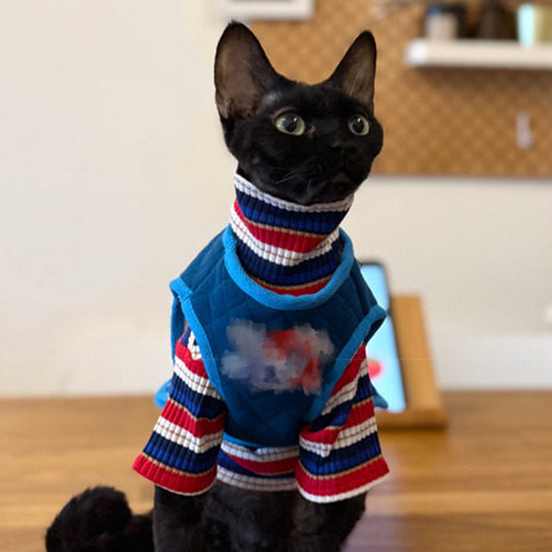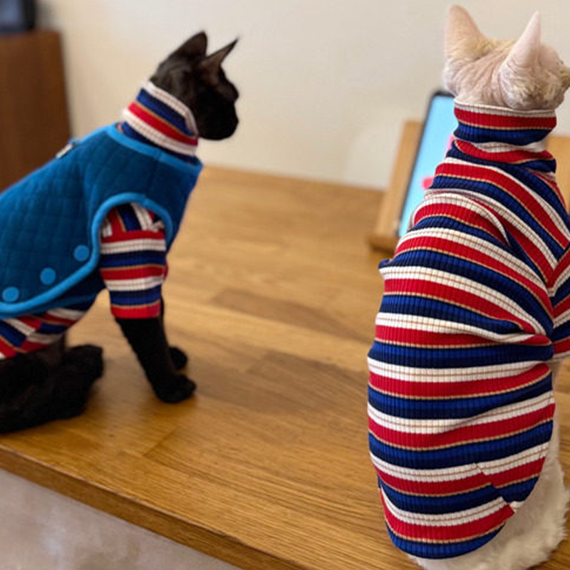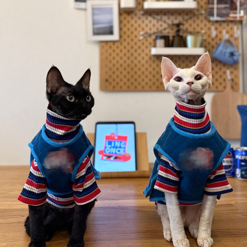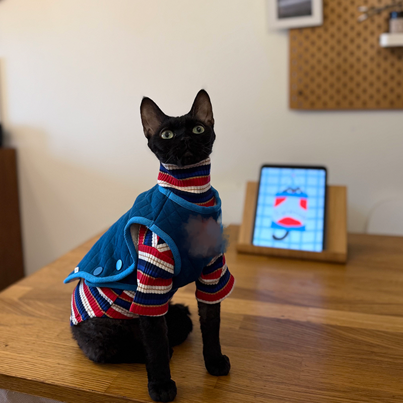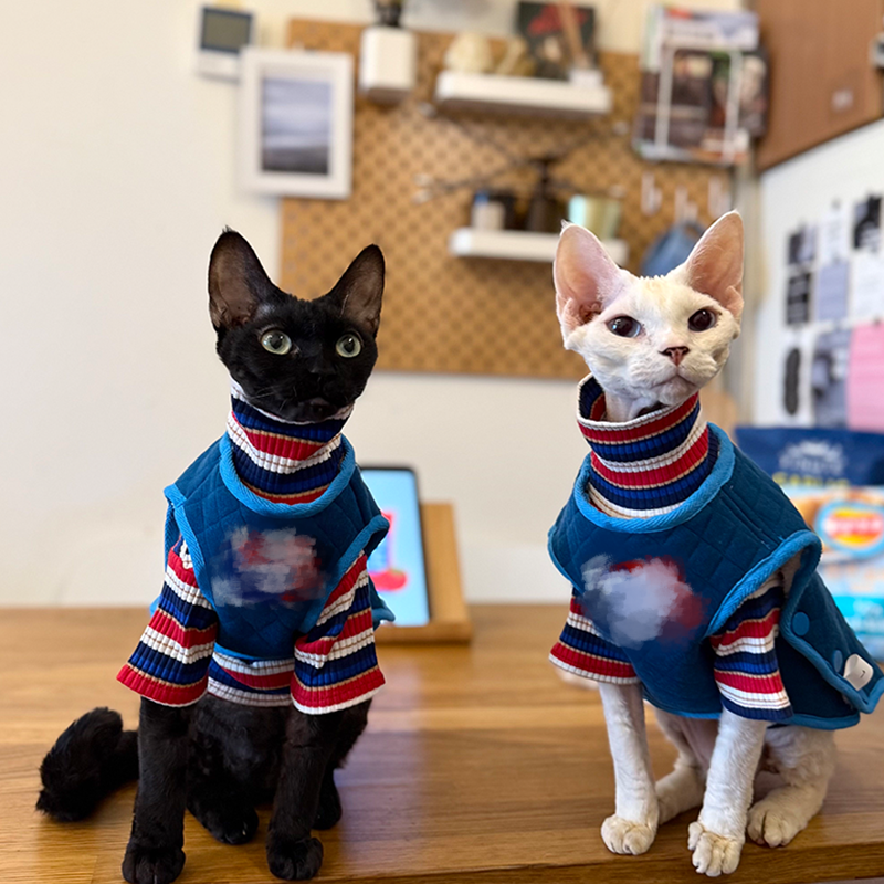 This cotton thickened shirt and vest set is designed for Sphynx cats to stay warm and comfortable during autumn and winter. Made from soft pure cotton fabric, the layered set provides gentle insulation without irritation, offering a snug fit and cozy warmth suitable for daily wear and indoor comfort.