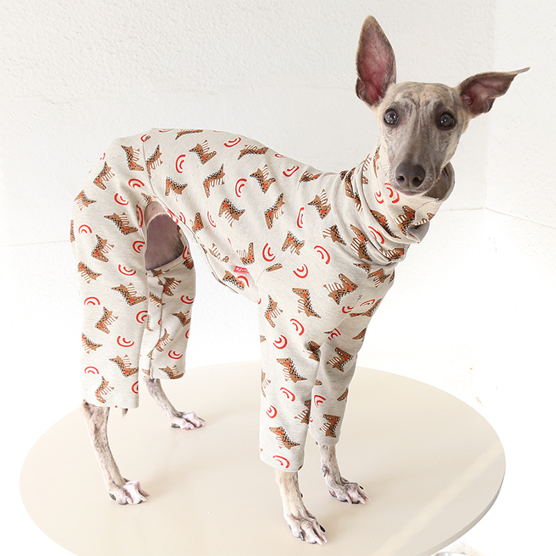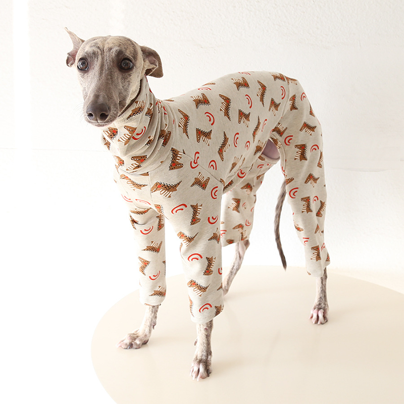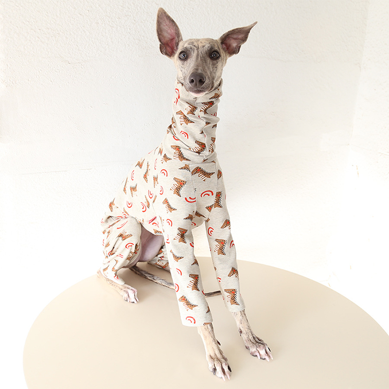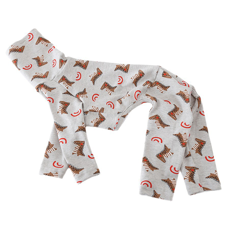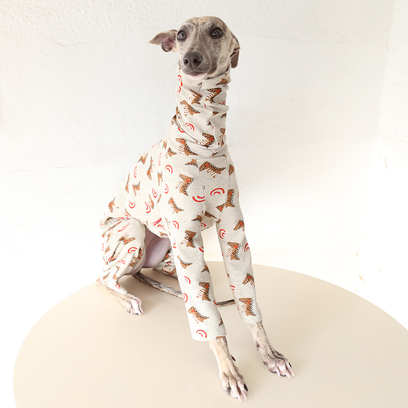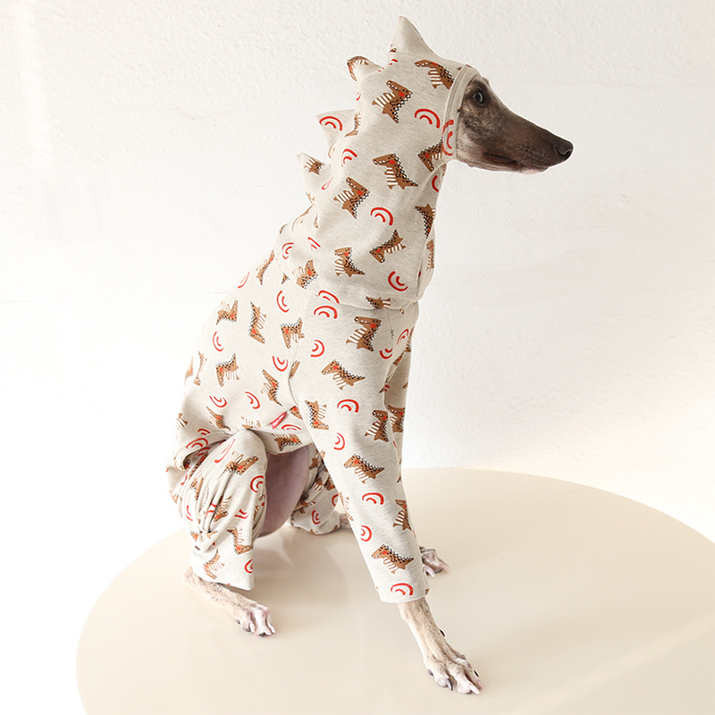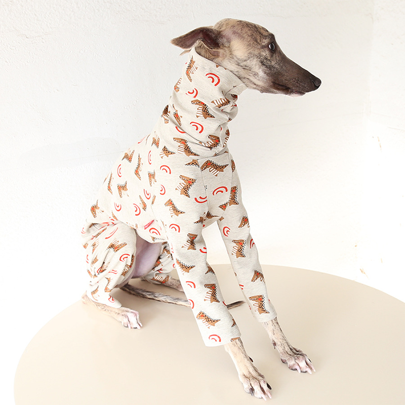 This dinosaur print color cotton onesies is designed for Italian Greyhound and Whippet dogs to enjoy soft and skin friendly comfort during rest time. Made with gentle cotton fabric, it feels breathable and cozy, making it ideal for sleeping and indoor lounging. This design does not include a leash opening, providing a smooth and uninterrupted fit for relaxation and bedtime wear.
