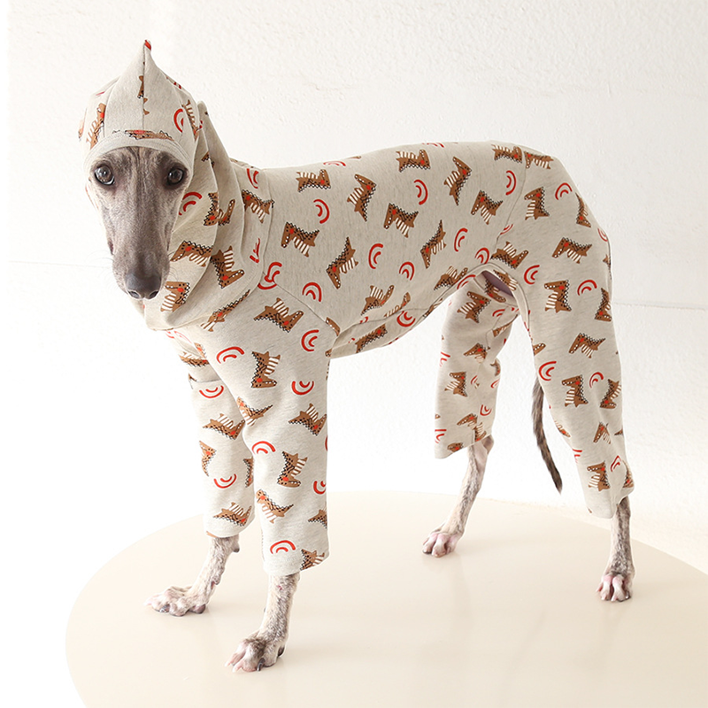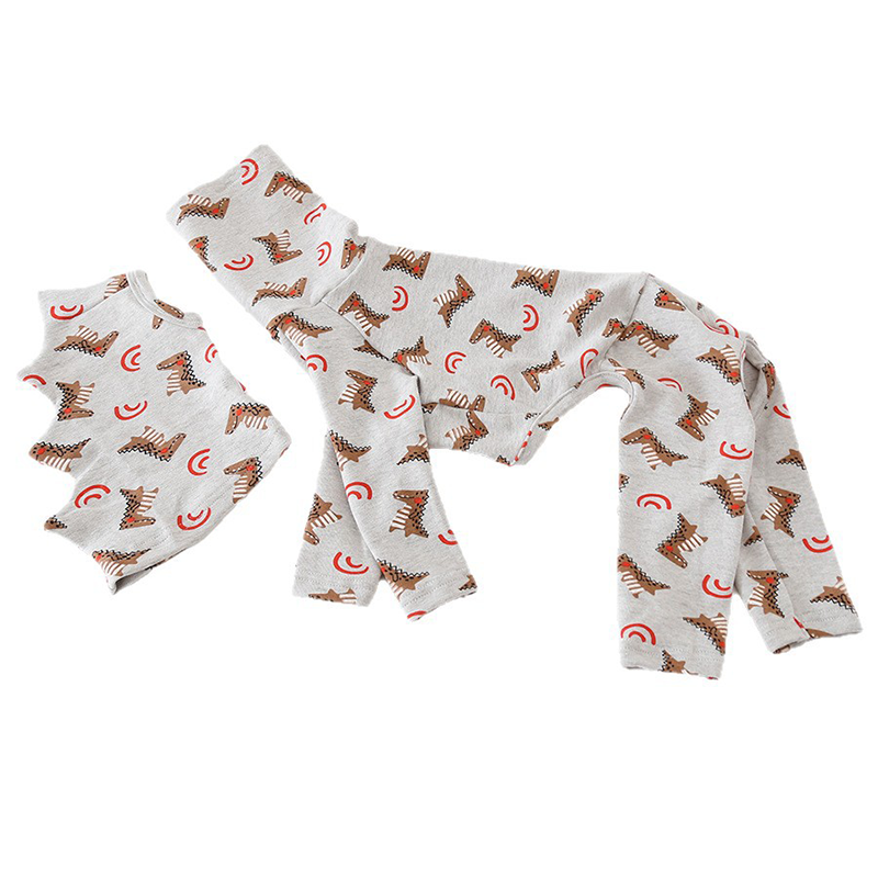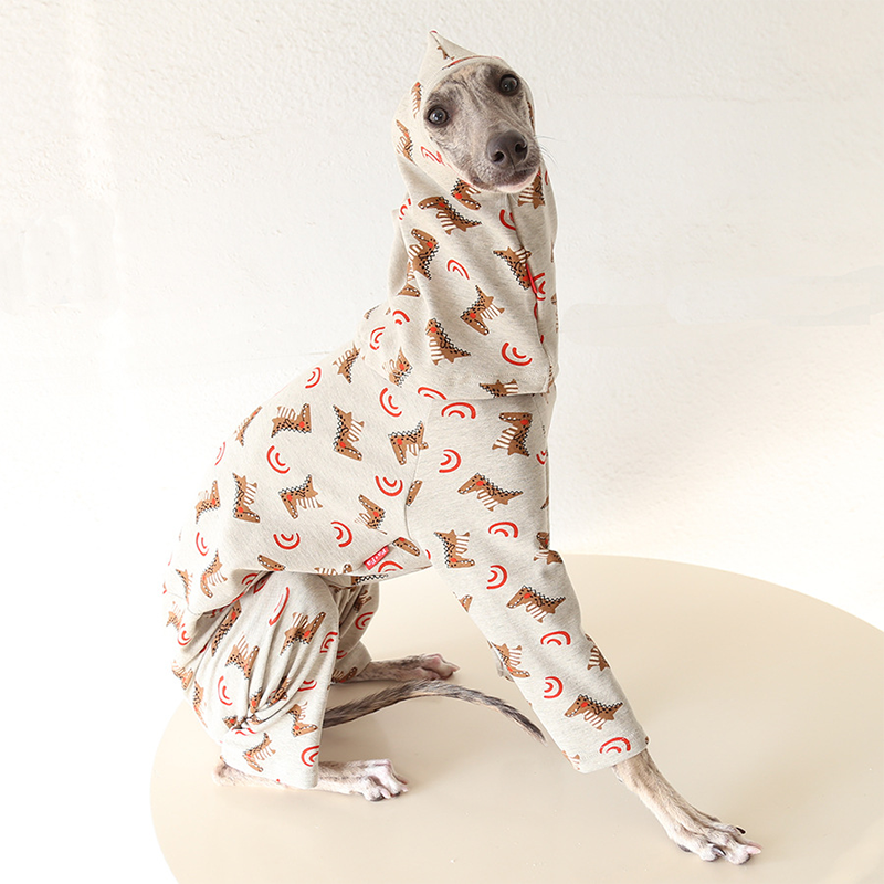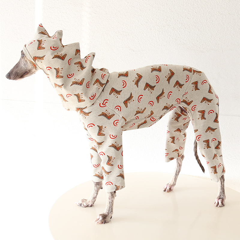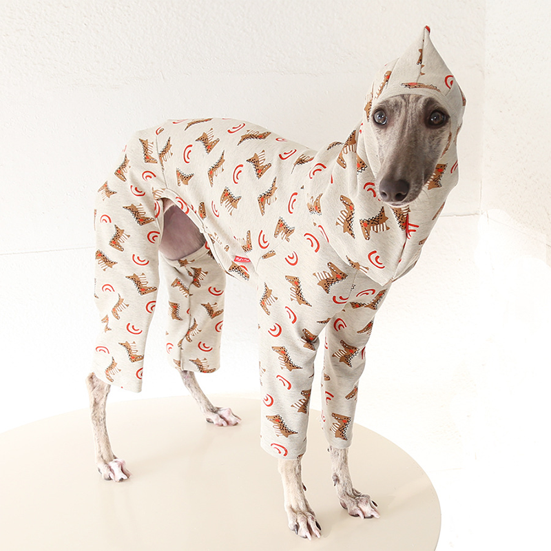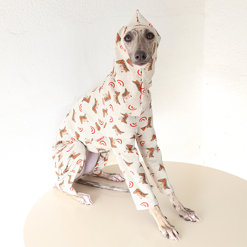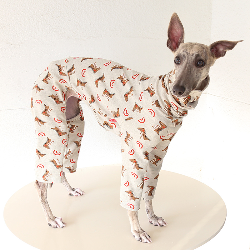 This dinosaur print color cotton onesies is designed for Italian Greyhound and Whippet dogs to enjoy soft and skin friendly comfort during rest time. Made with gentle cotton fabric, it feels breathable and cozy, making it ideal for sleeping and indoor lounging. This design does not include a leash opening, providing a smooth and uninterrupted fit for relaxation and bedtime wear.