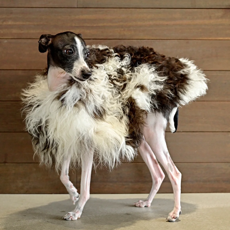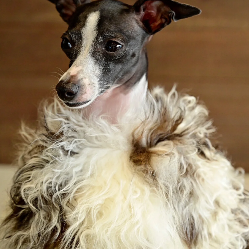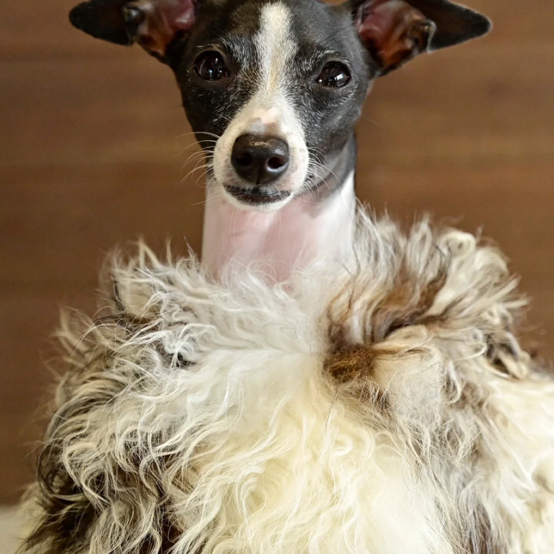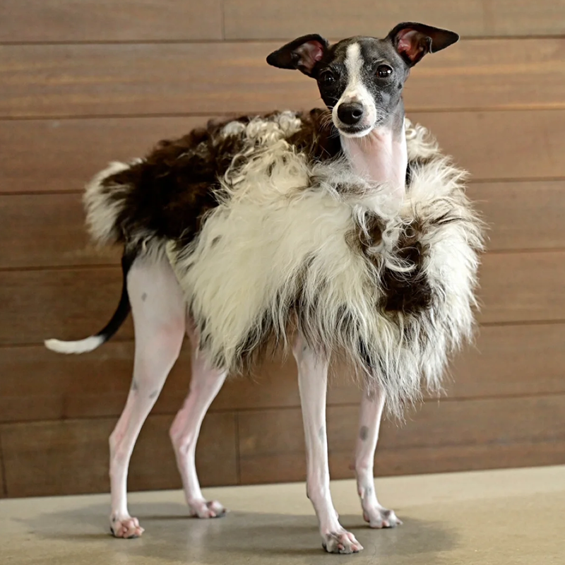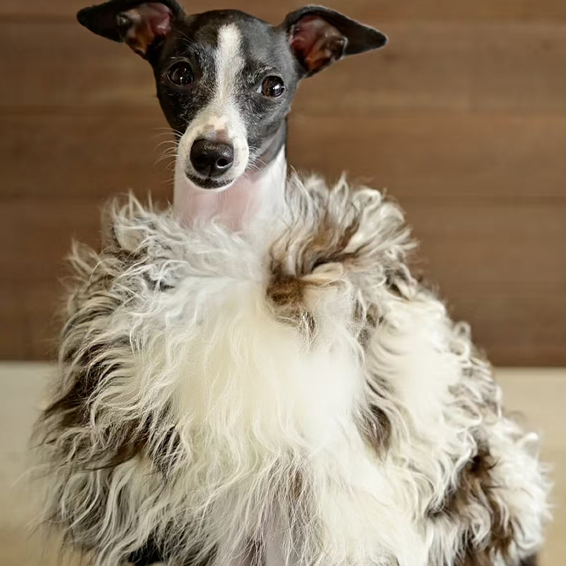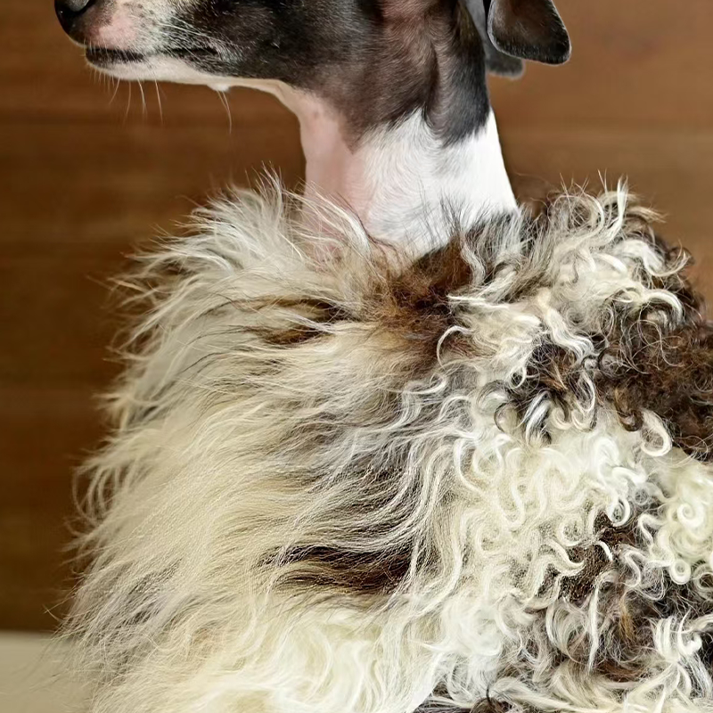 This genuine leather wool fur coat with a natural pattern is designed for Italian Greyhound and Whippet dogs to stay warm and elegant during cold seasons. Crafted with premium leather and naturally patterned wool fur, it provides excellent insulation, a soft luxurious feel, and a unique texture, making it ideal for winter outings and special occasions.