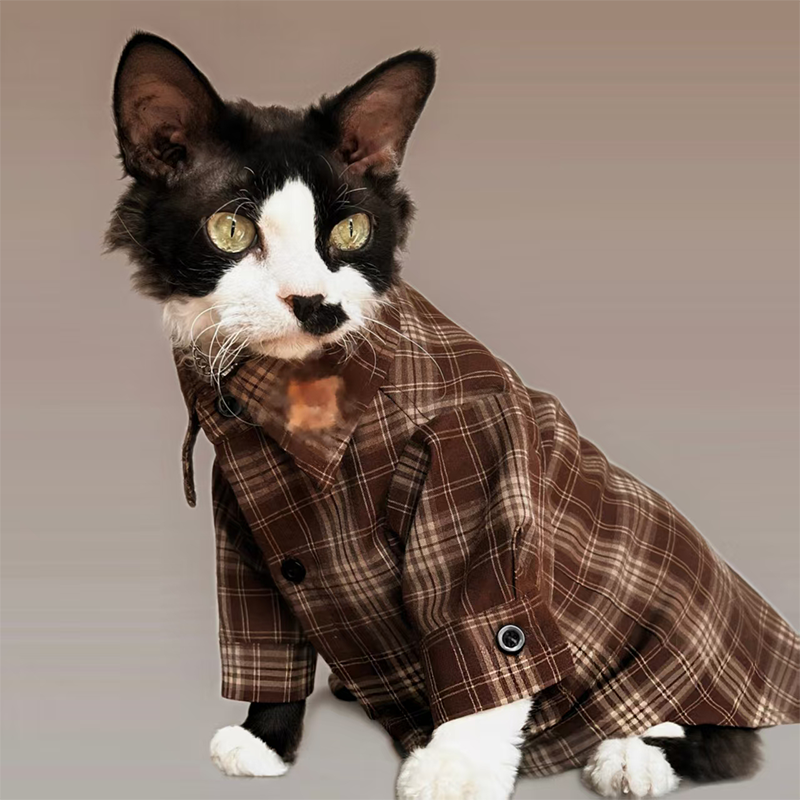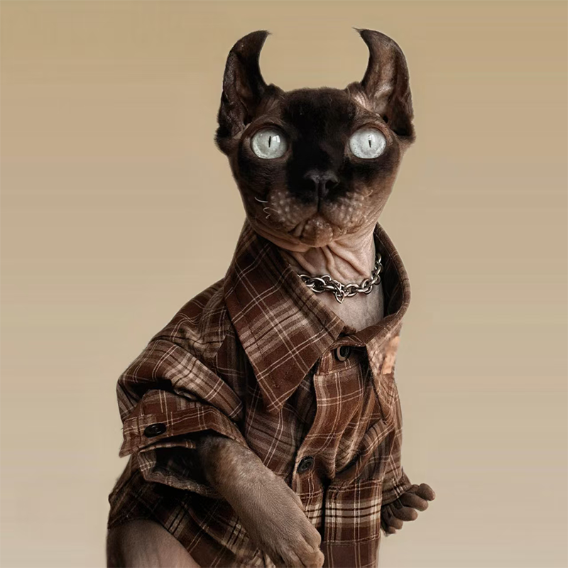 This vintage plaid shirt coat is designed for Sphynx and Devon cats to wear comfortably during spring and autumn. Made with lightweight and breathable fabric, it offers a soft feel on the skin while providing a stylish retro look, making it suitable for daily wear, indoor lounging, and casual outings.