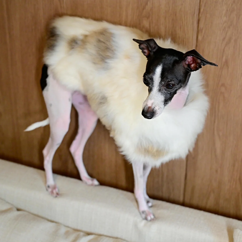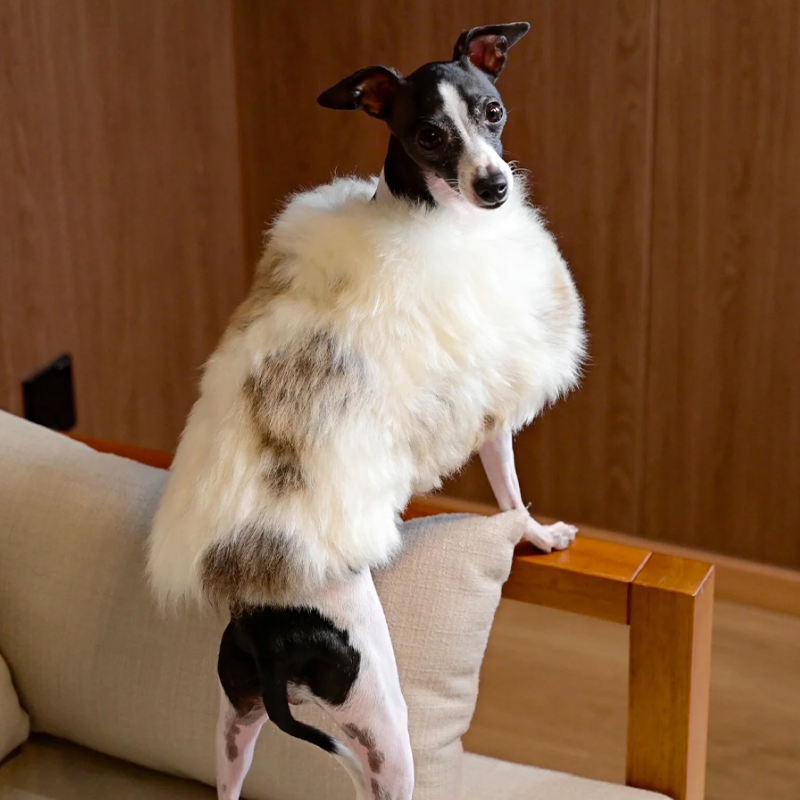 Designed for small Greyhound and Whippet dogs, this natural wool fur coat offers warm and breathable protection for cold weather. Crafted with natural tone wool fur, it provides soft insulation while maintaining a lightweight and comfortable feel. The structured outer layer is tailored to complement the slim body shape of sighthounds, delivering a secure and refined fit for winter walks or special outings. The timeless natural color enhances its elegant appearance, making it a versatile and sophisticated winter essential.