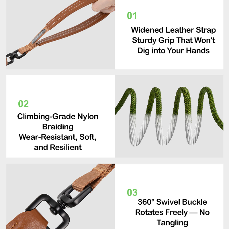 This dog slip lead leash features a durable rope body paired with a comfortable leather handle for improved grip and control during outdoor walks and training. Designed for anti-pull use, it helps manage sudden bursts of force, making it suitable for active or strong dogs. The integrated slip lead design combines collar and leash in one, allowing quick and easy use without extra hardware. Strong, practical, and reliable, this leash is ideal for daily walks, obedience training, and outdoor adventures where better control and comfort are needed.