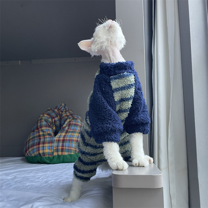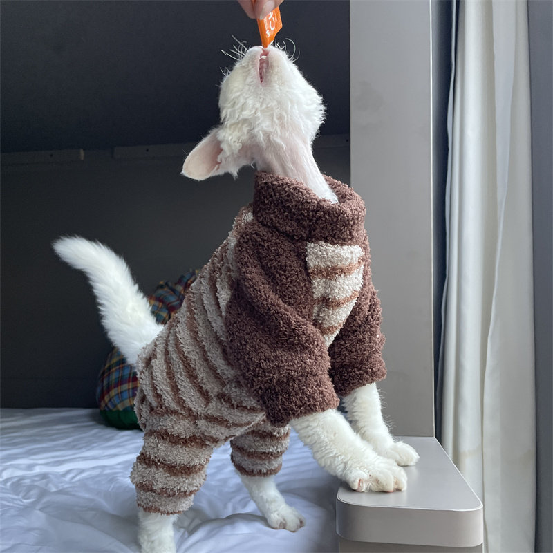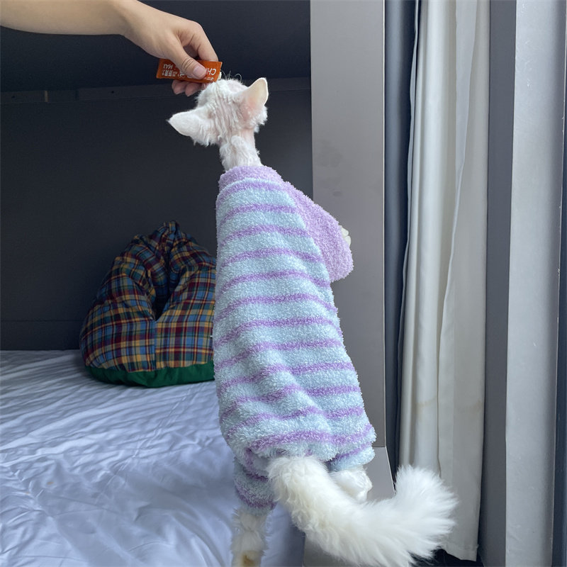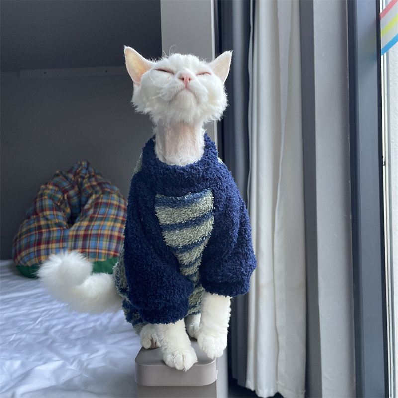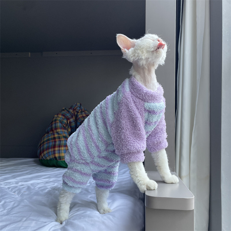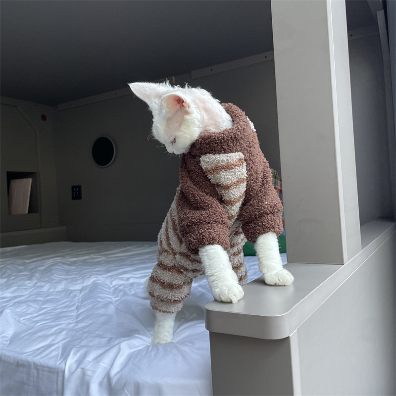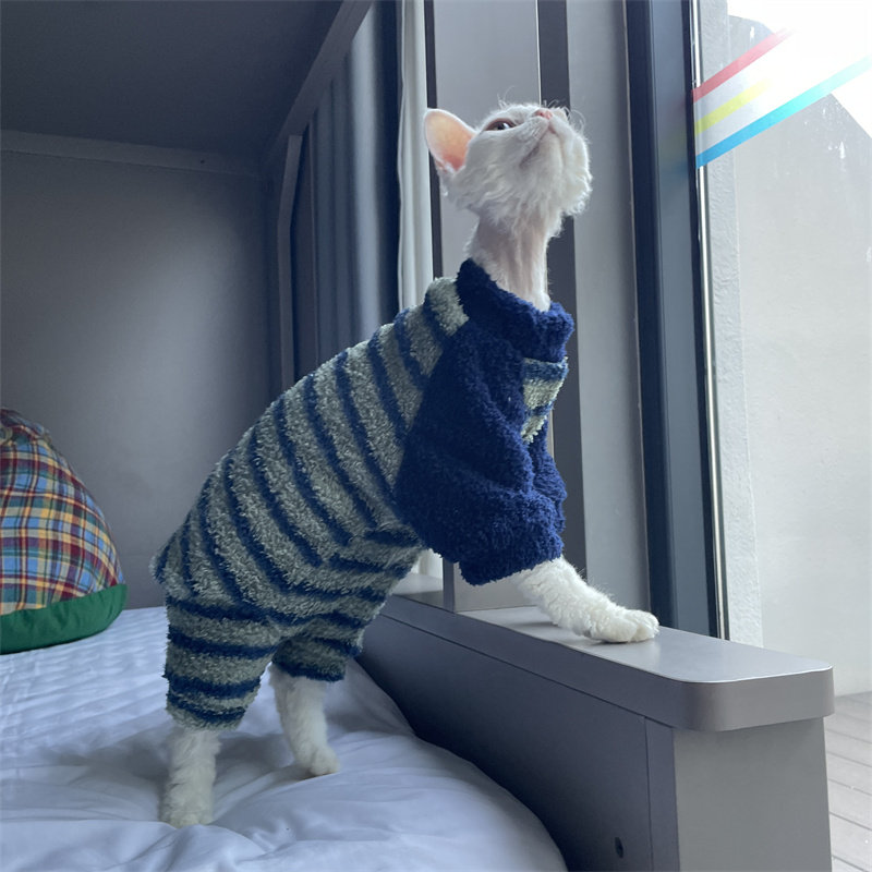 This plush stretch onesies is designed for devon rex and sphynx cat with four leg coverage to provide soft warmth and flexibility during autumn and winter. Cozy, elastic, and comfortable, it fits close to the body while allowing easy movement for everyday wear.