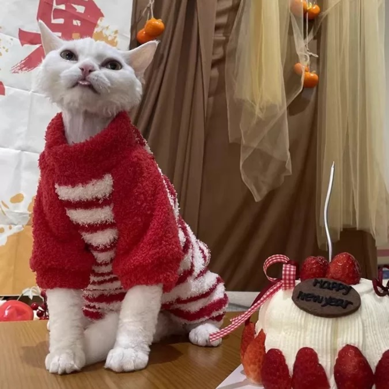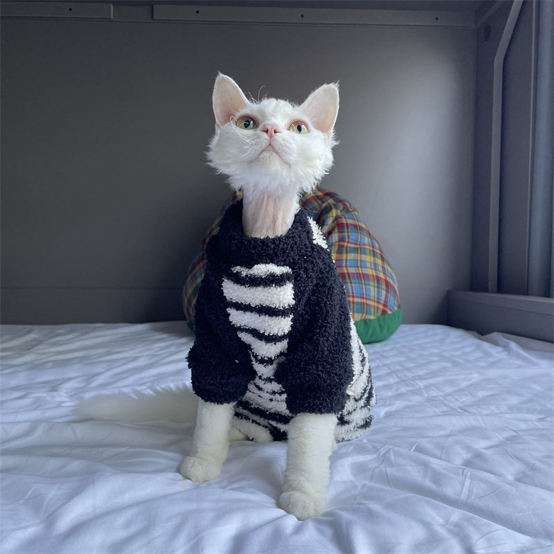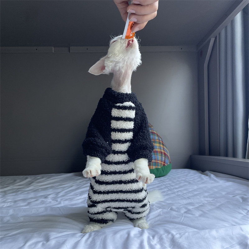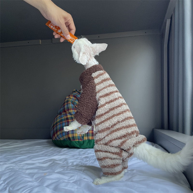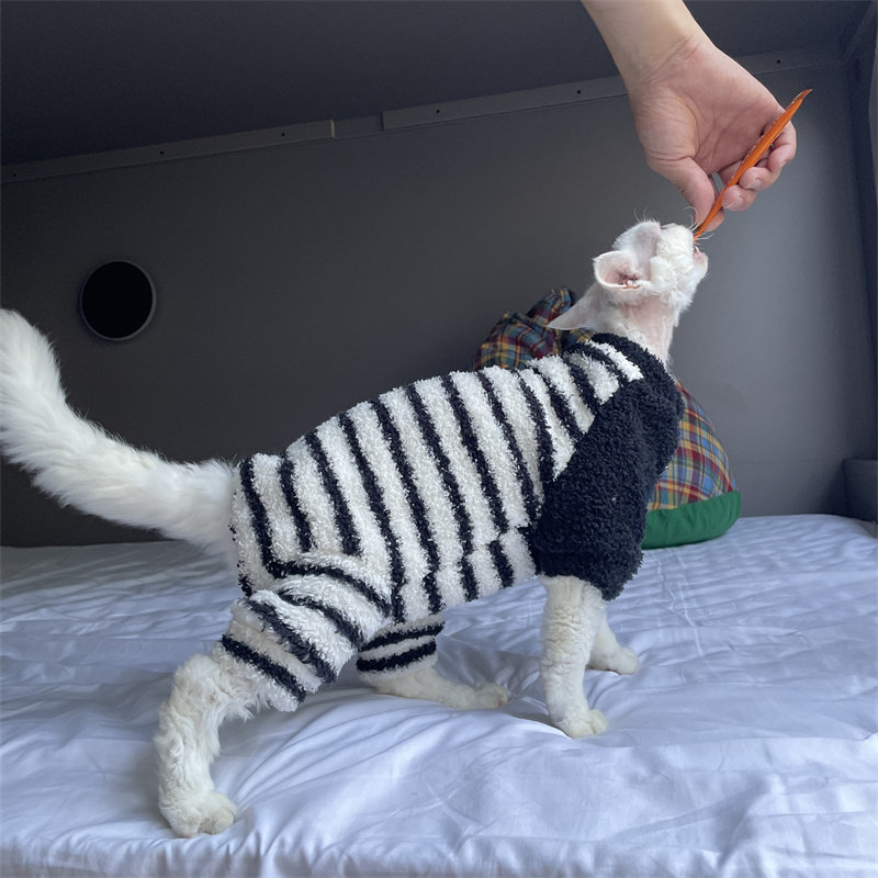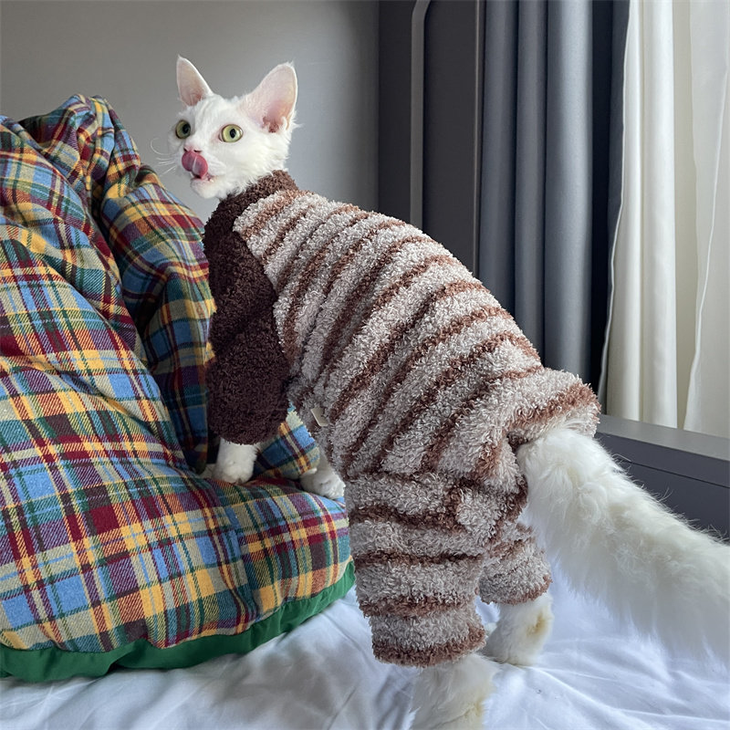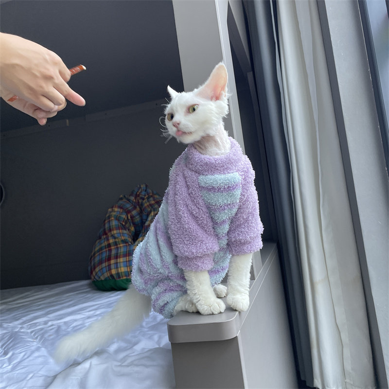 This plush stretch onesies is designed for devon rex and sphynx cat with four leg coverage to provide soft warmth and flexibility during autumn and winter. Cozy, elastic, and comfortable, it fits close to the body while allowing easy movement for everyday wear.