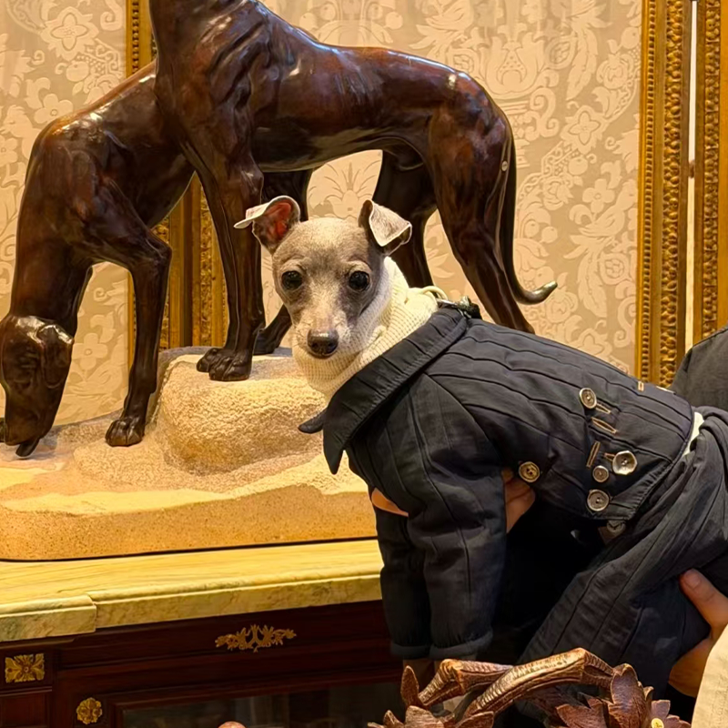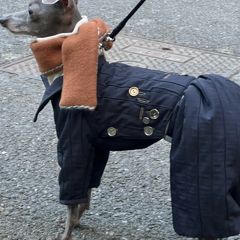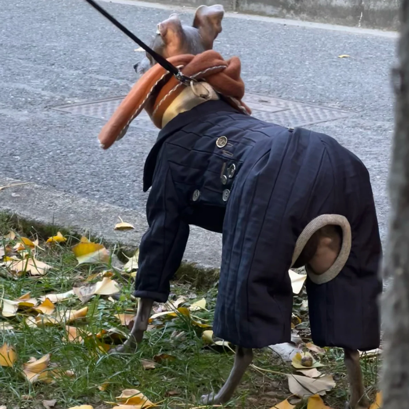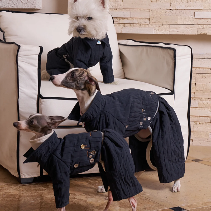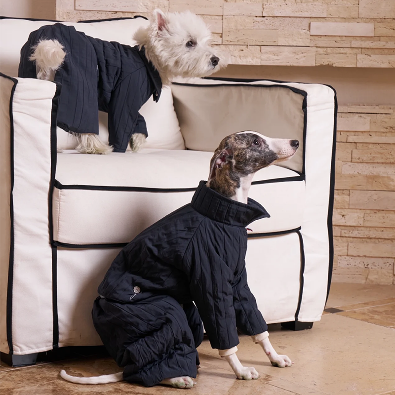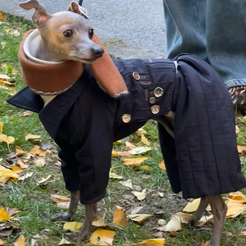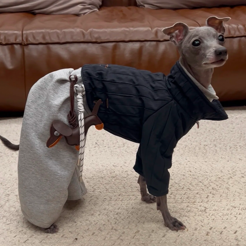 Designed for small Greyhound and Whippet dogs, this quilted fall winter two piece set offers lightweight warmth with a stylish lifted back design. The quilted fabric provides soft insulation while remaining breathable and comfortable for everyday wear. The detachable design allows the top and pants to be worn together or separately for versatile styling across changing temperatures. Tailored to suit the slim build of sighthounds, the structured fit ensures comfort without restricting movement, making it ideal for daily walks and cool season outings.