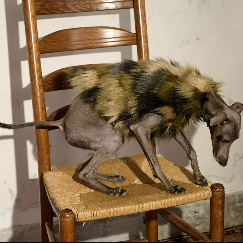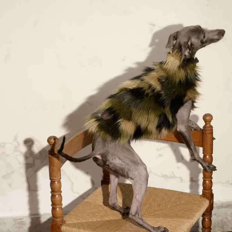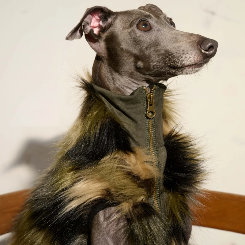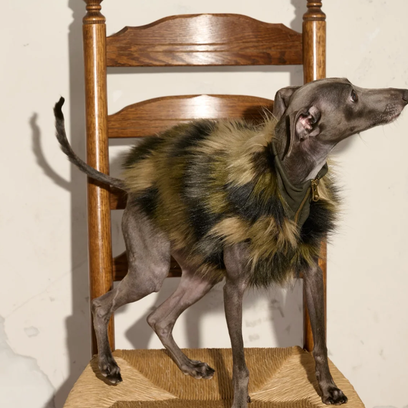 This suede patch high collar eco fur coat is designed for Italian Greyhound dogs to stay warm and stylish during winter. Made with soft suede panels and eco-friendly faux fur, it provides cozy insulation, a comfortable fit, and a refined look, making it ideal for daily wear, outdoor walks, and cold weather protection. This design does not include a leash opening.