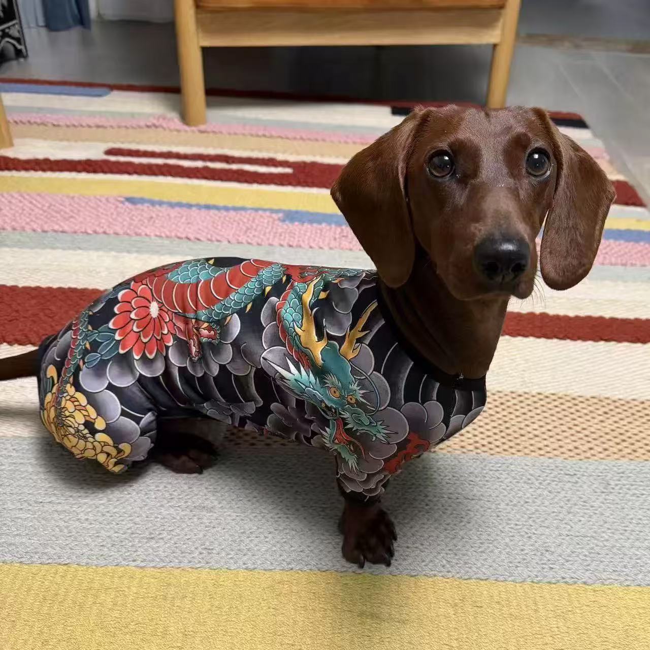 This tattoo style four leg onesies outfit is designed for big dogs who love a bold and unique outdoor look. Featuring an all over tattoo inspired pattern and a full coverage four leg design, it offers a comfortable fit that allows free movement while adding strong personality and style, making it ideal for outdoor walks, training, and everyday wear.The clean back design features no leash opening.