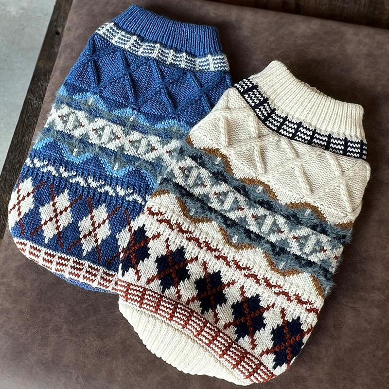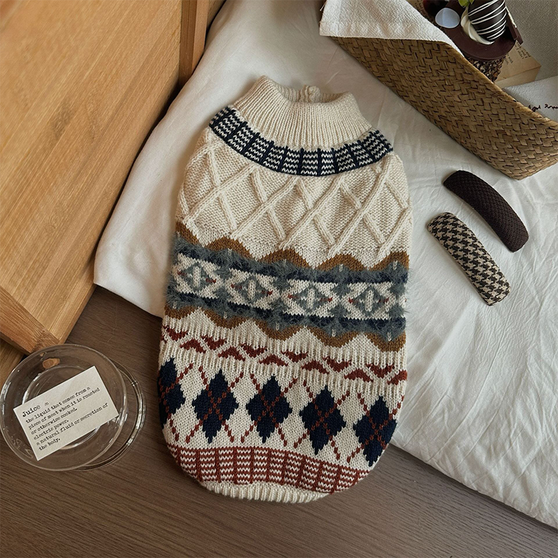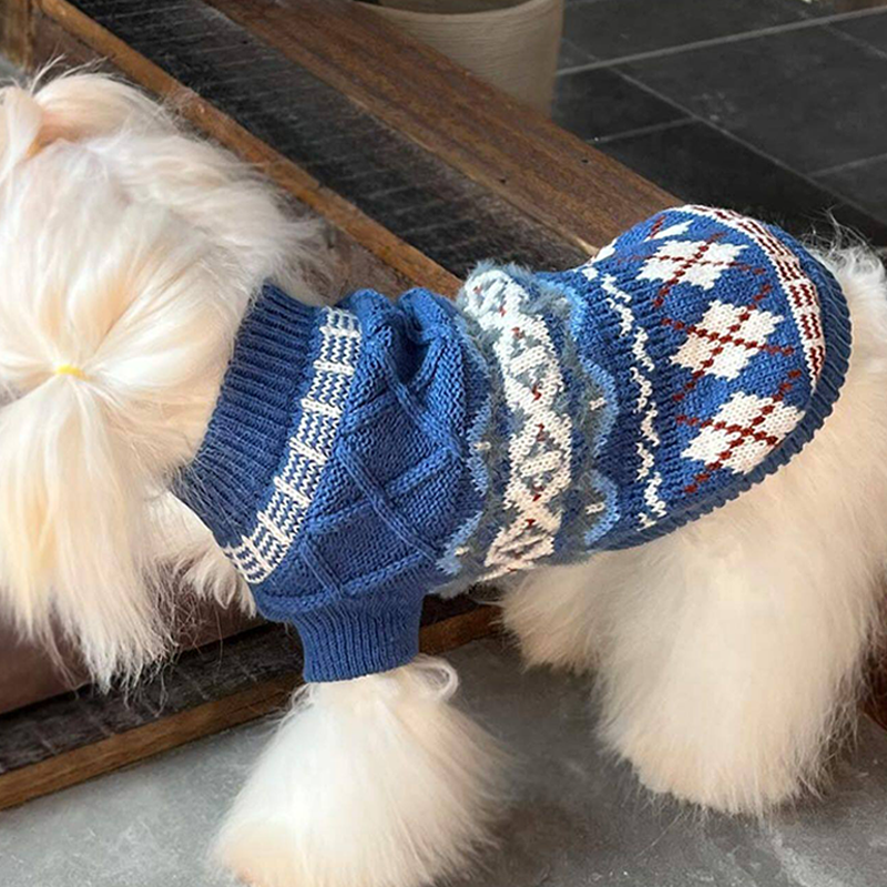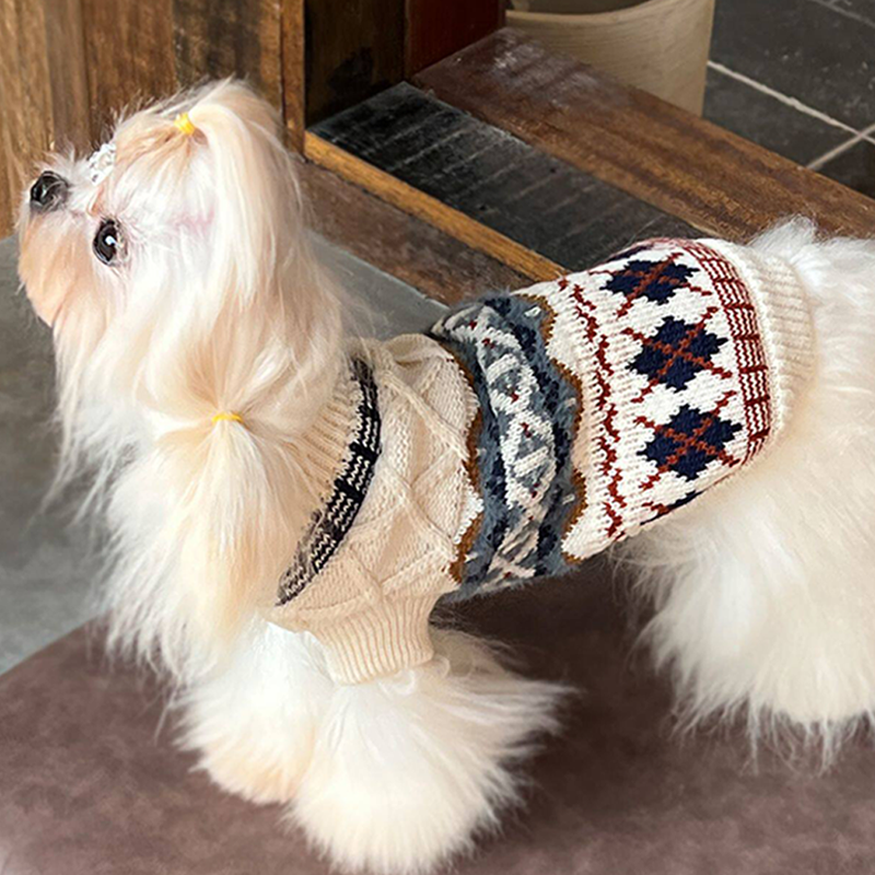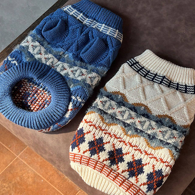 Designed for small medium dogs, this vintage knitted fall winter sweaters offers classic style with cozy seasonal warmth. The soft knit fabric provides breathable insulation while remaining comfortable for everyday wear. The relaxed two leg construction allows natural movement through the chest and shoulders, making it suitable for indoor lounging or outdoor walks in cooler weather. With its timeless retro inspired design, this sweater adds charm and warmth while maintaining a comfortable and flexible fit for your dog.