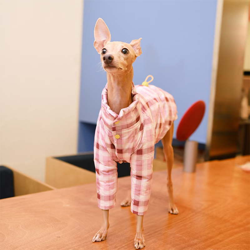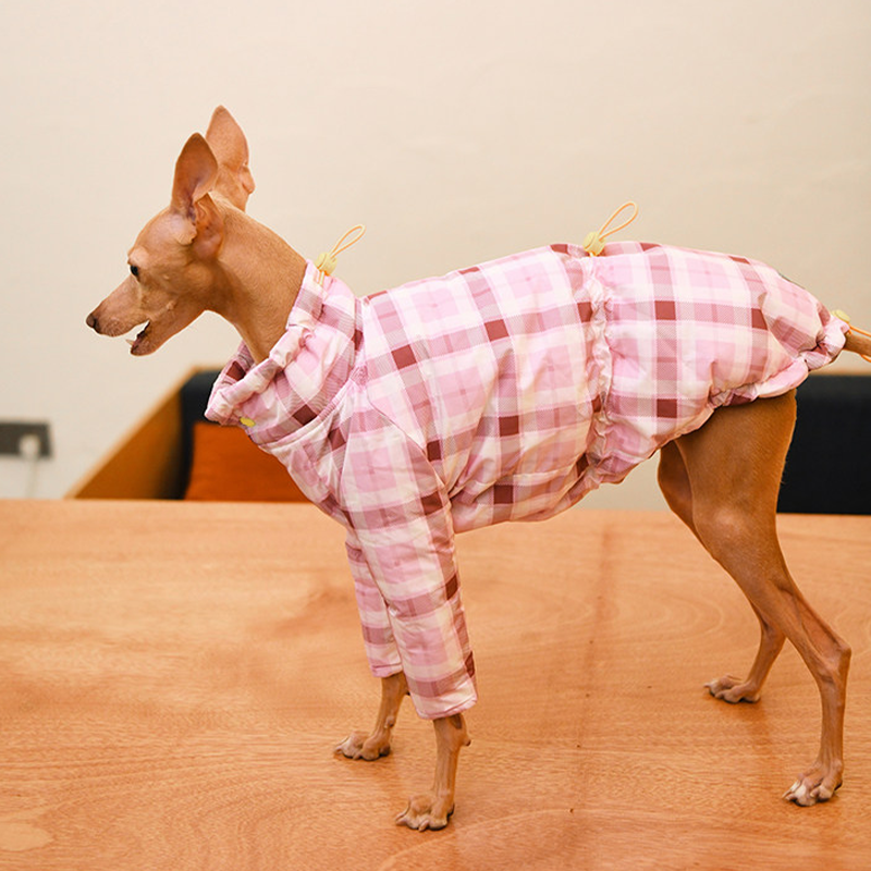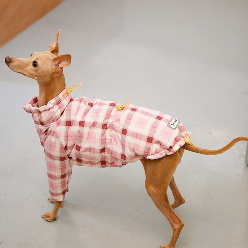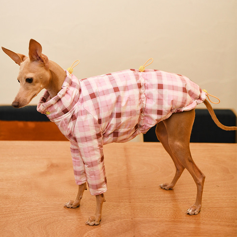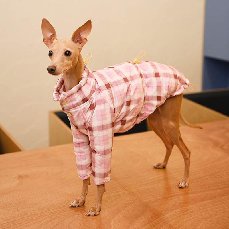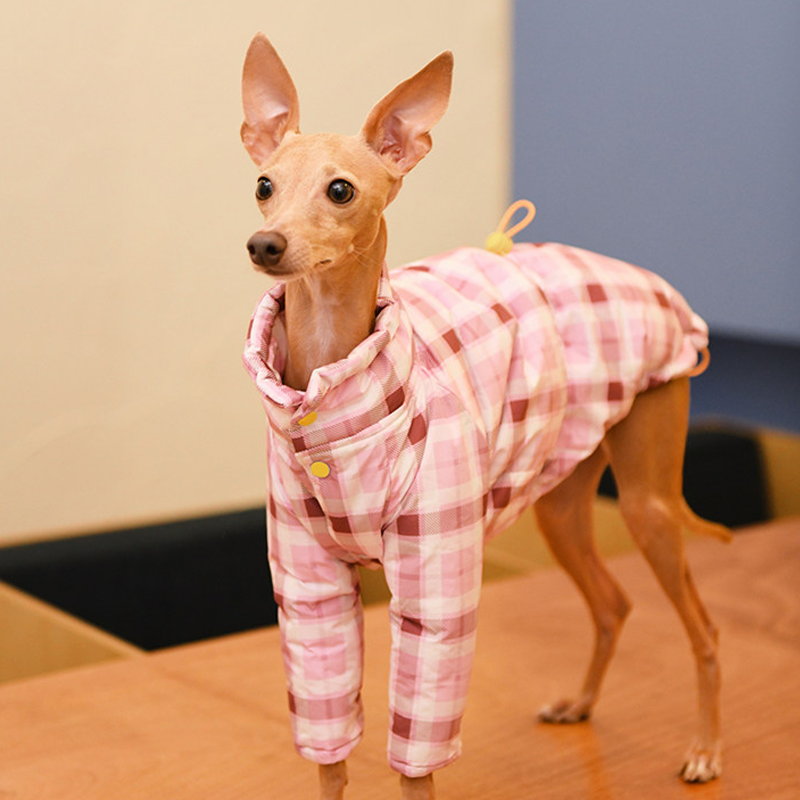 Designed for small Greyhound and Whippet dogs, this thick plaid winter two leg coat provides extra warmth and comfort during cold weather. The insulated cotton padding helps retain body heat while remaining lightweight enough for daily walks and outdoor activities. The two leg design allows easy movement and quick dressing, while the tailored fit follows the slim body shape of sighthounds for a secure and comfortable feel. Perfect for winter outings, this coat keeps your dog warm without restricting mobility.