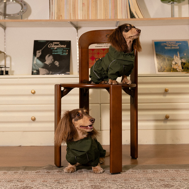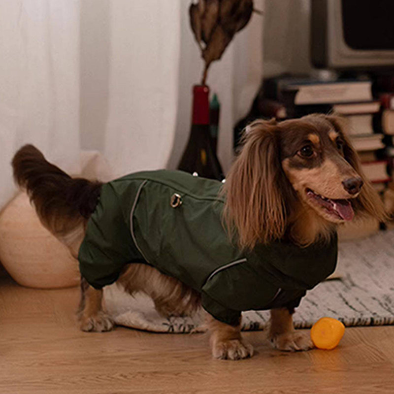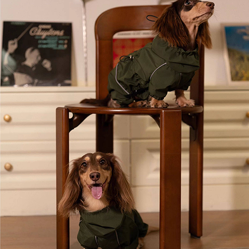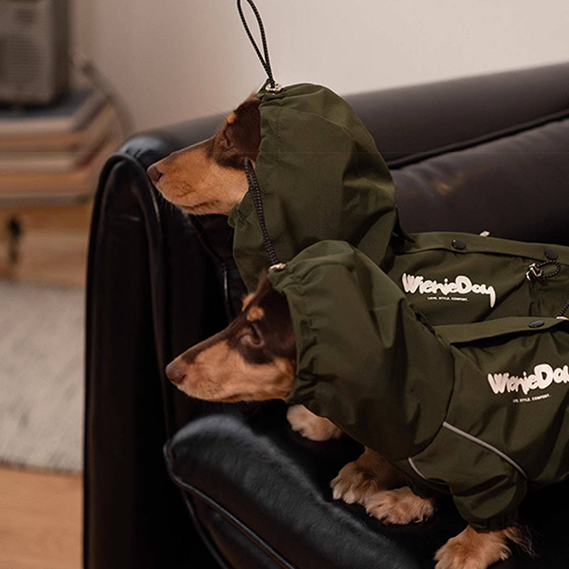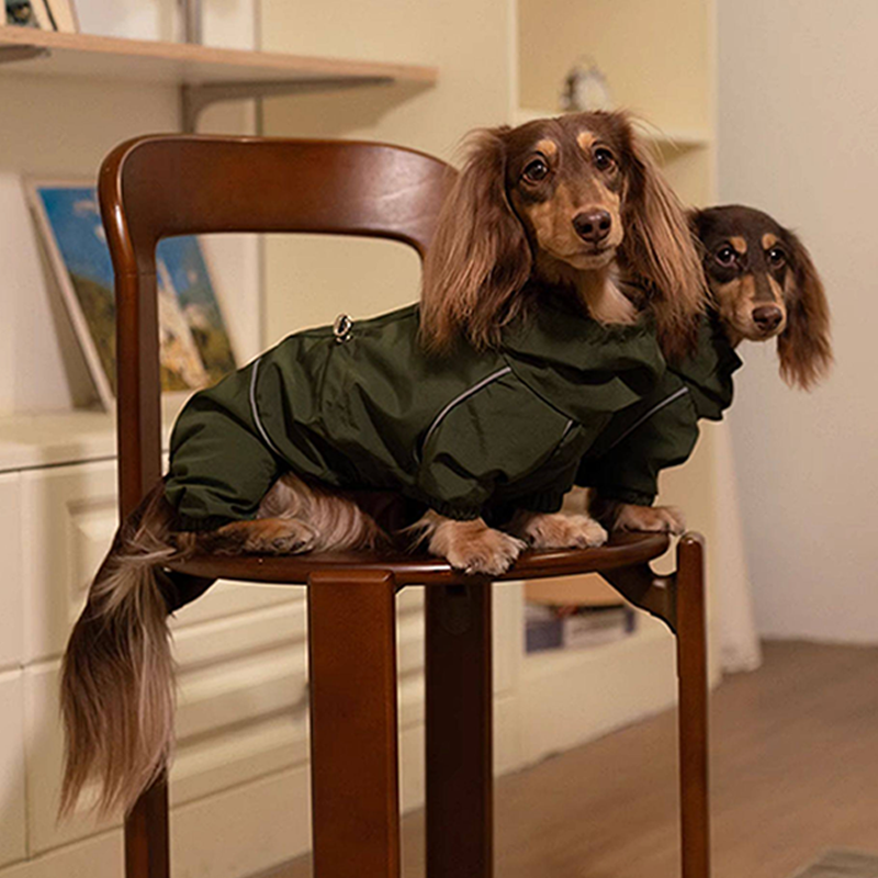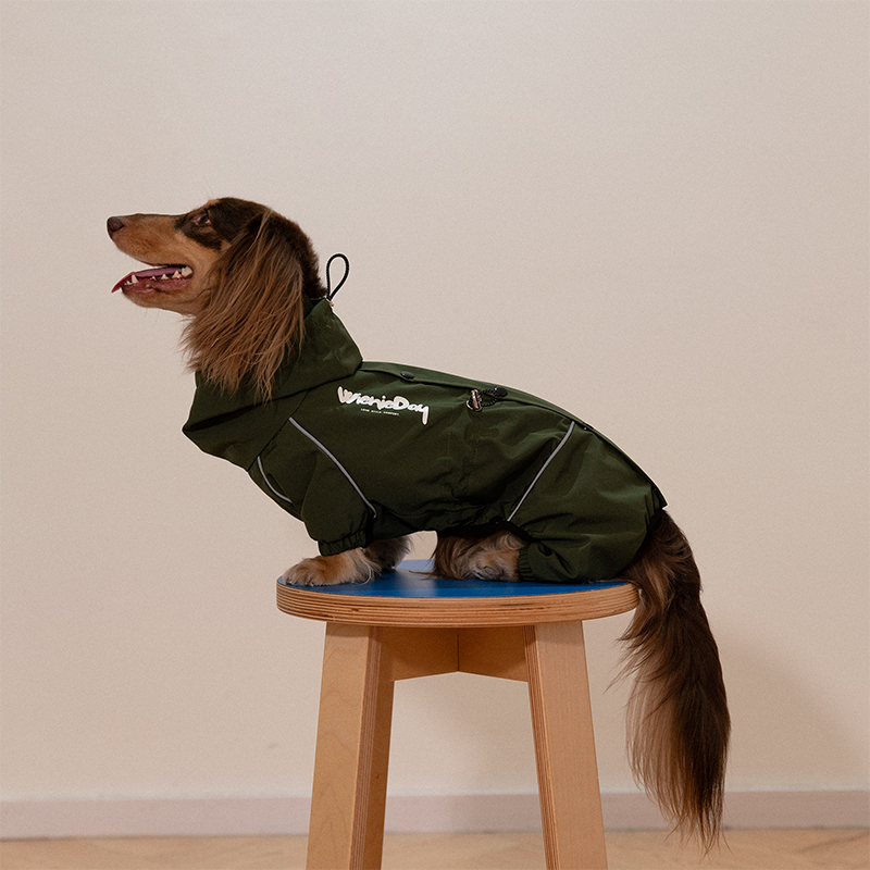 Designed for dachshunds, this waterproof outdoor raincoat jacket provides reliable protection during rainy and windy weather. The durable water resistant fabric helps keep your dog dry while remaining lightweight and comfortable for outdoor activities. The full coverage design protects the chest, belly, and legs from rain, mud, and splashes, making it ideal for walks in wet conditions. Tailored for the long body shape of dachshunds, it offers a flexible fit that allows natural movement while keeping your dog protected and comfortable outdoors.