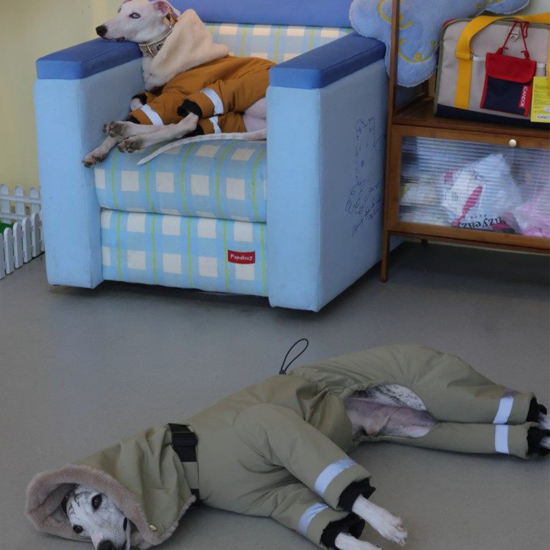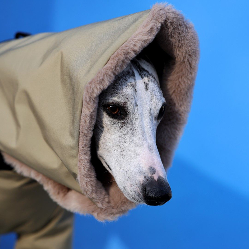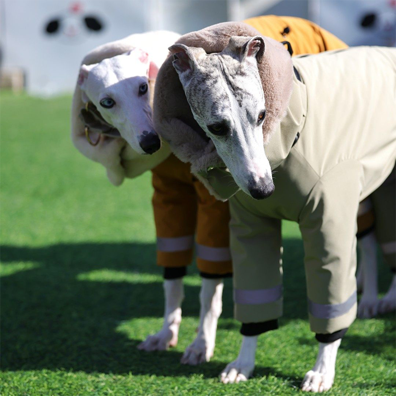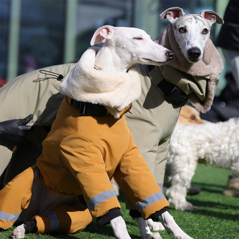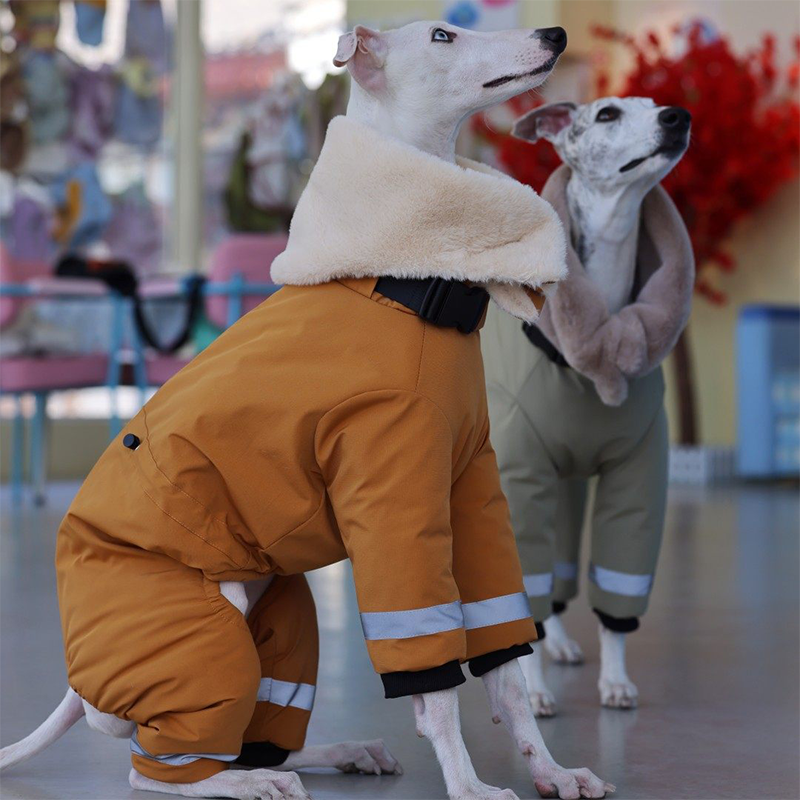 This waterproof thick padded high neck snowsuits is designed for Italian Greyhounds and Whippets to stay warm and protected in cold weather. Featuring an ultra thick insulated structure and a built in collar, it provides excellent warmth while maintaining a sleek fit for sighthounds. The coat includes a built in leash ring, allowing easy leash attachment without the need for an additional harness, making it ideal for winter walks and outdoor wear.