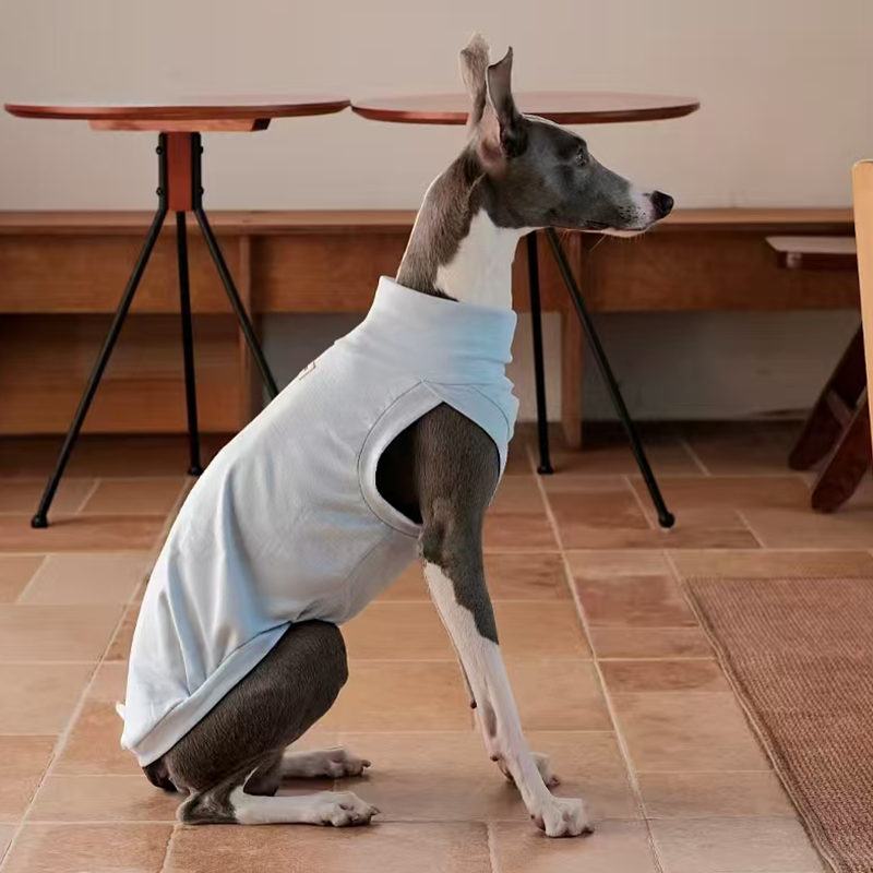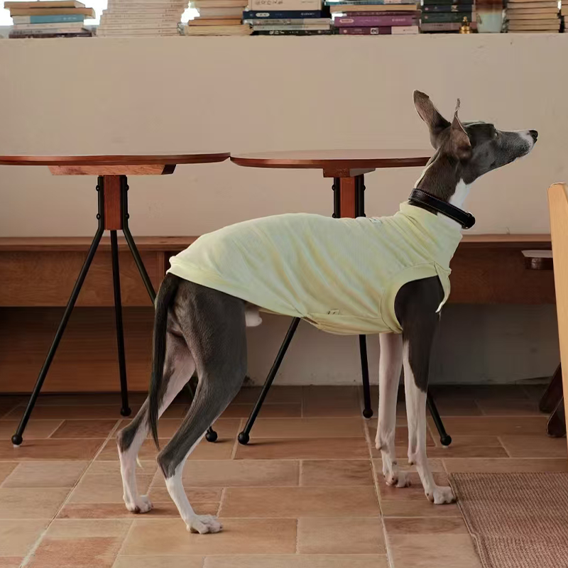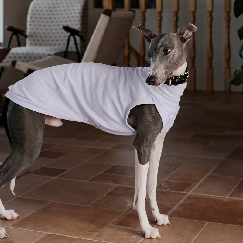 This ultra-thin vest is designed for Whippets and Greyhounds, providing lightweight comfort for hot summer days. Made from soft, skin-friendly fabric, it offers a gentle touch while ensuring excellent breathability to help keep your dog cool. The sleeveless, minimal design allows full freedom of movement without restriction, making it ideal for daily wear, indoor lounging, or light outdoor activities. Comfortable and easy to put on, this vest is perfect for protecting sensitive skin while maintaining a cool and airy feel in warm weather.
