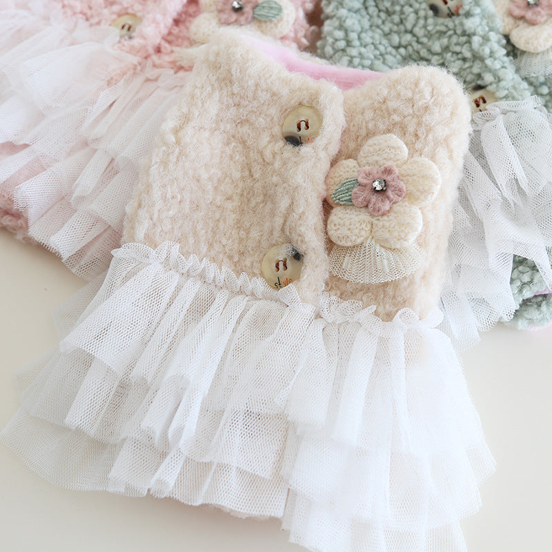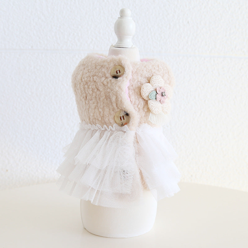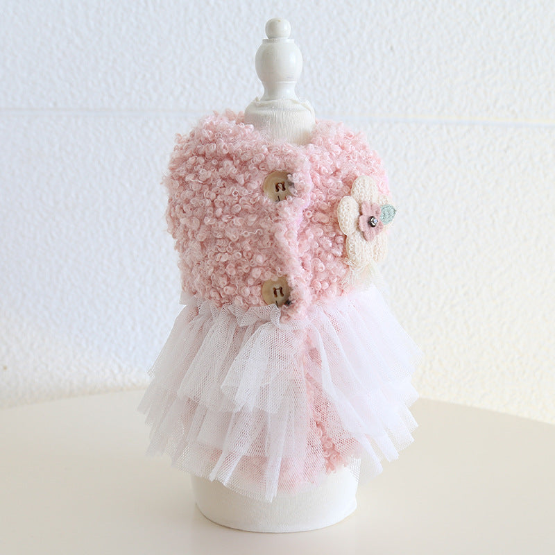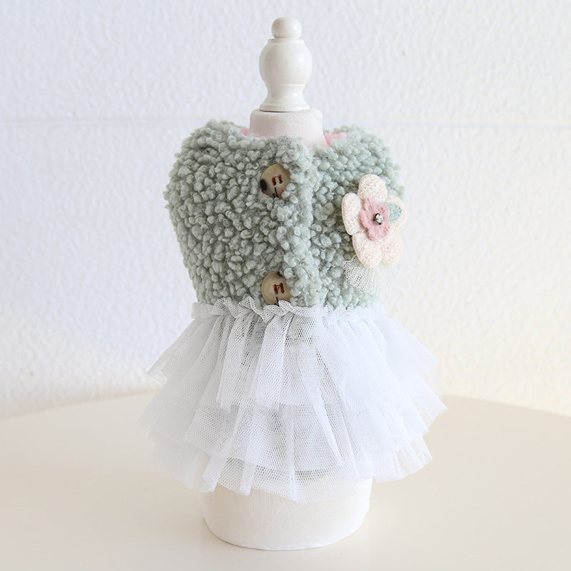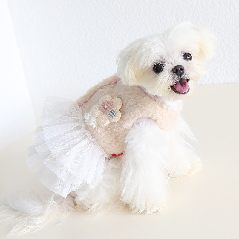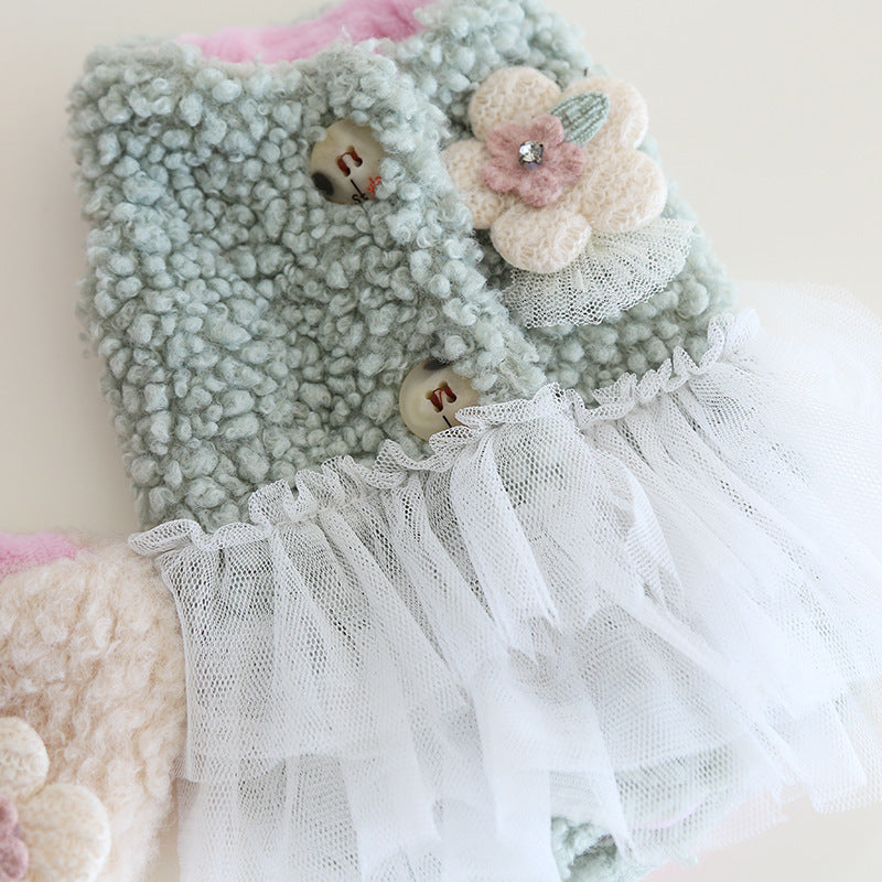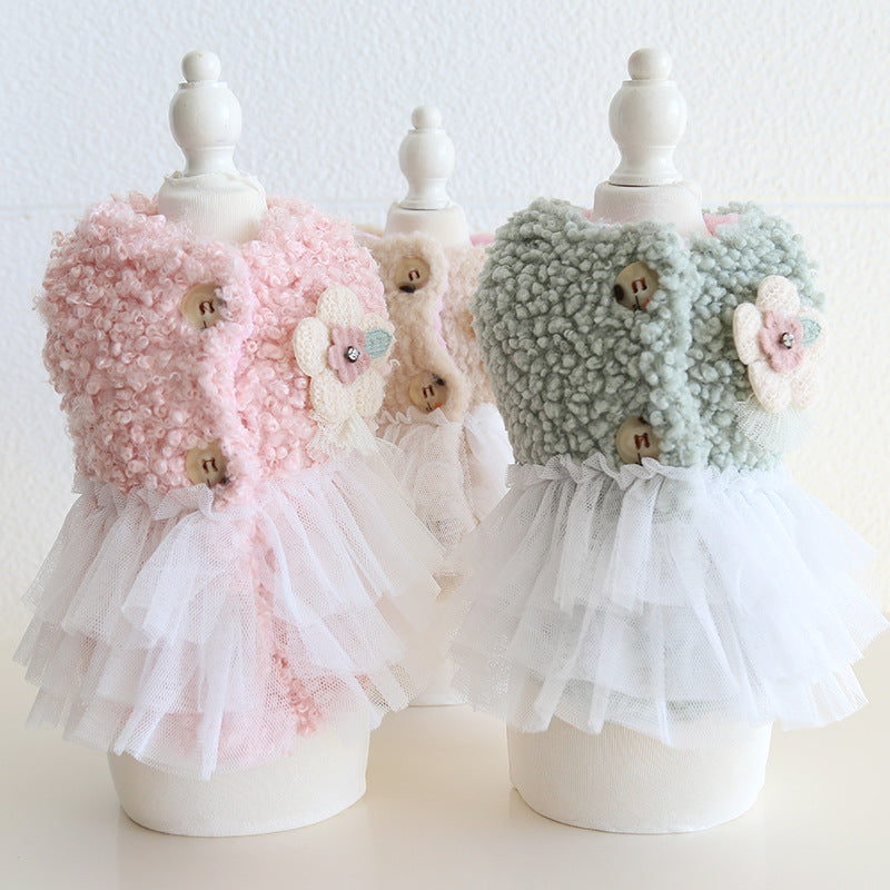 Winter Warm Dress Tricolor Floral Furry Tulle Dog for Small Medium Dogs Pet Clothing